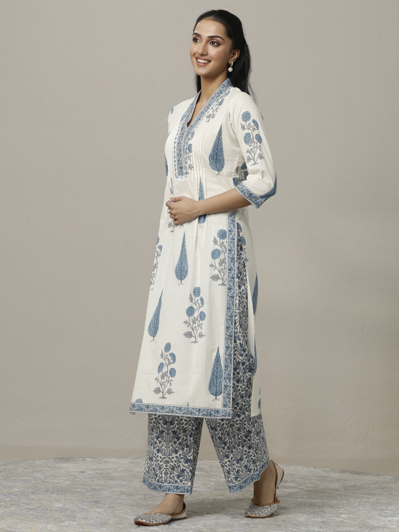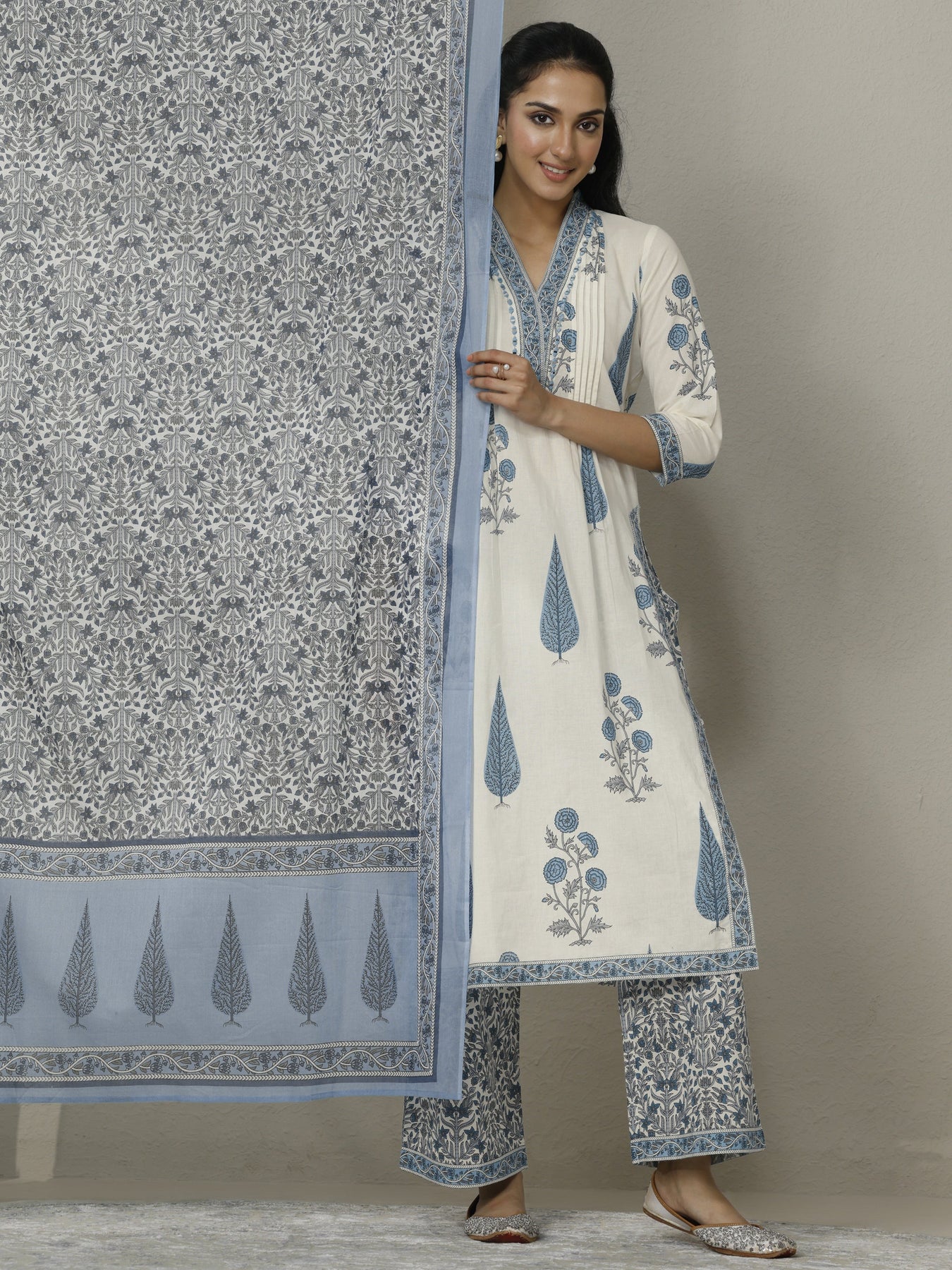 Our 3-piece Off White and Blue Cotton Straight-Fit Kurta Set features a V-Neckline, Regular Sleeves, and statement yoke. Complemented with Palazzo Pants with a Partially Elasticated waistband and 2 pockets, and a Printed dupatta. Adorned with floral printed, this style is perfect for Work Wear and Casual Wear.