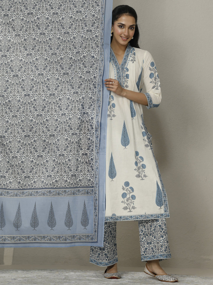 Off White Printed Cotton Straight Suit Set With Dupatta
