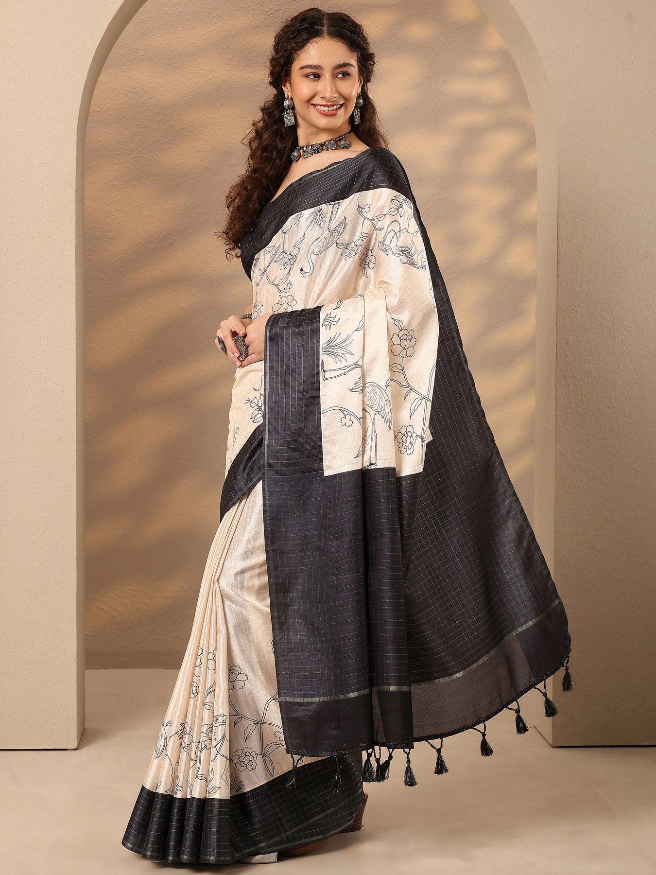 Our Off White Printed Silk Blend Saree Features Captivating Floral. Complemented With An Unstitched Blouse Piece. This Charming Saree Is Perfect For Festive Occasions.