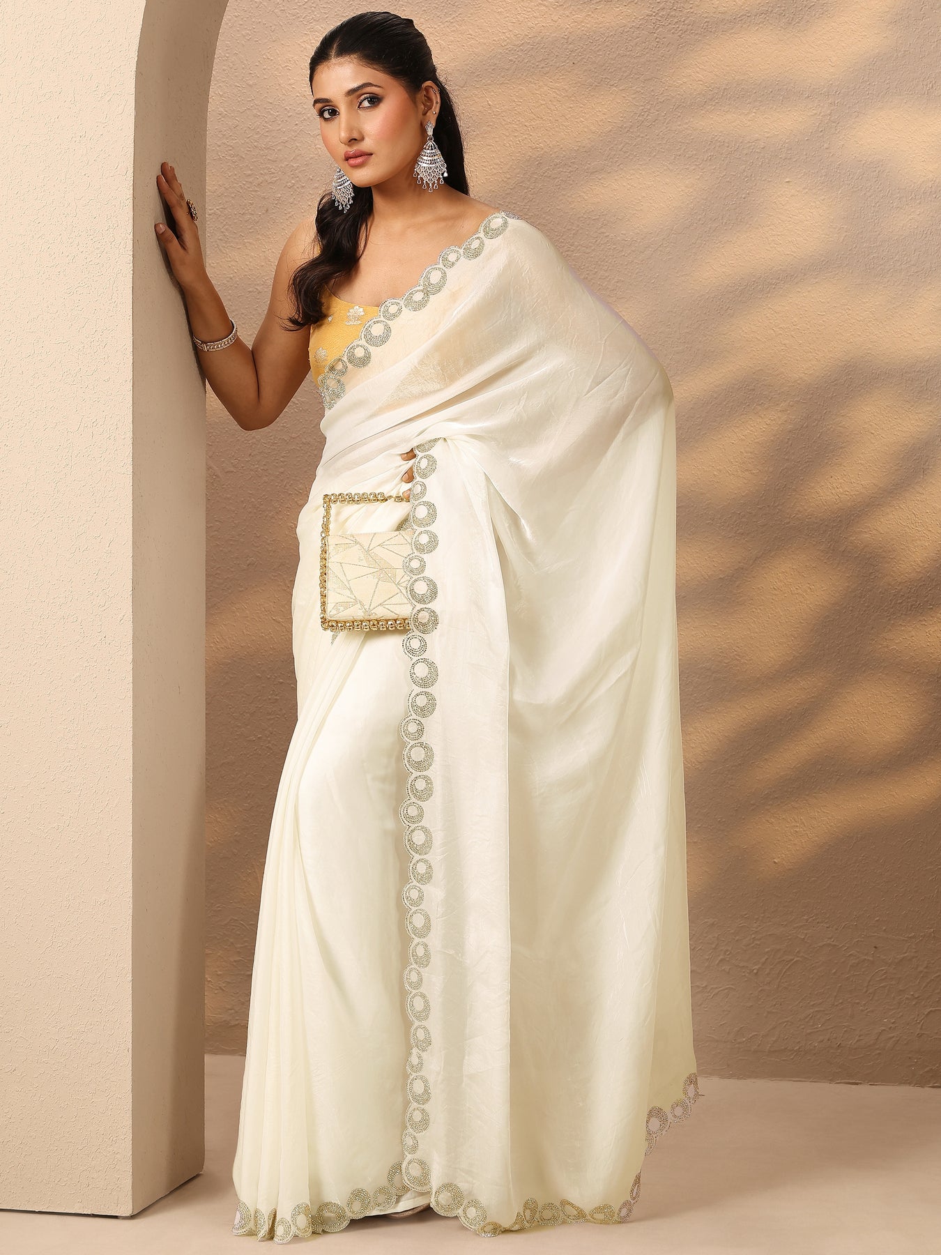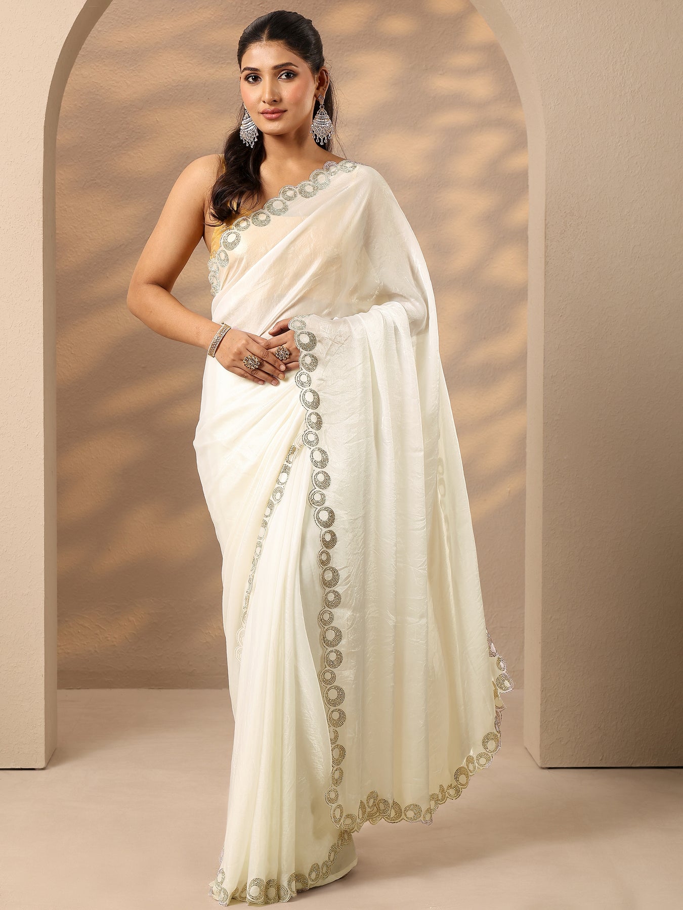 Our Off White Solid Sarees Silk Blend Saree Features Captivating Solid. Complemented With An Unstitched Blouse Piece. This Charming Saree Is Perfect For Festive Occasions.