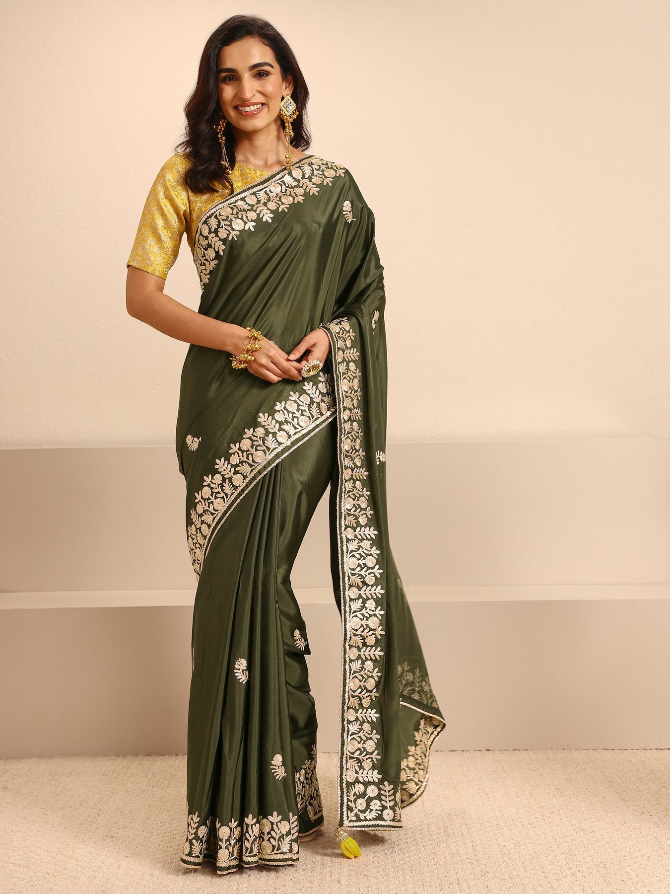 Olive Green Embroidered Silk Blend Saree With Unstitched Blouse Piece