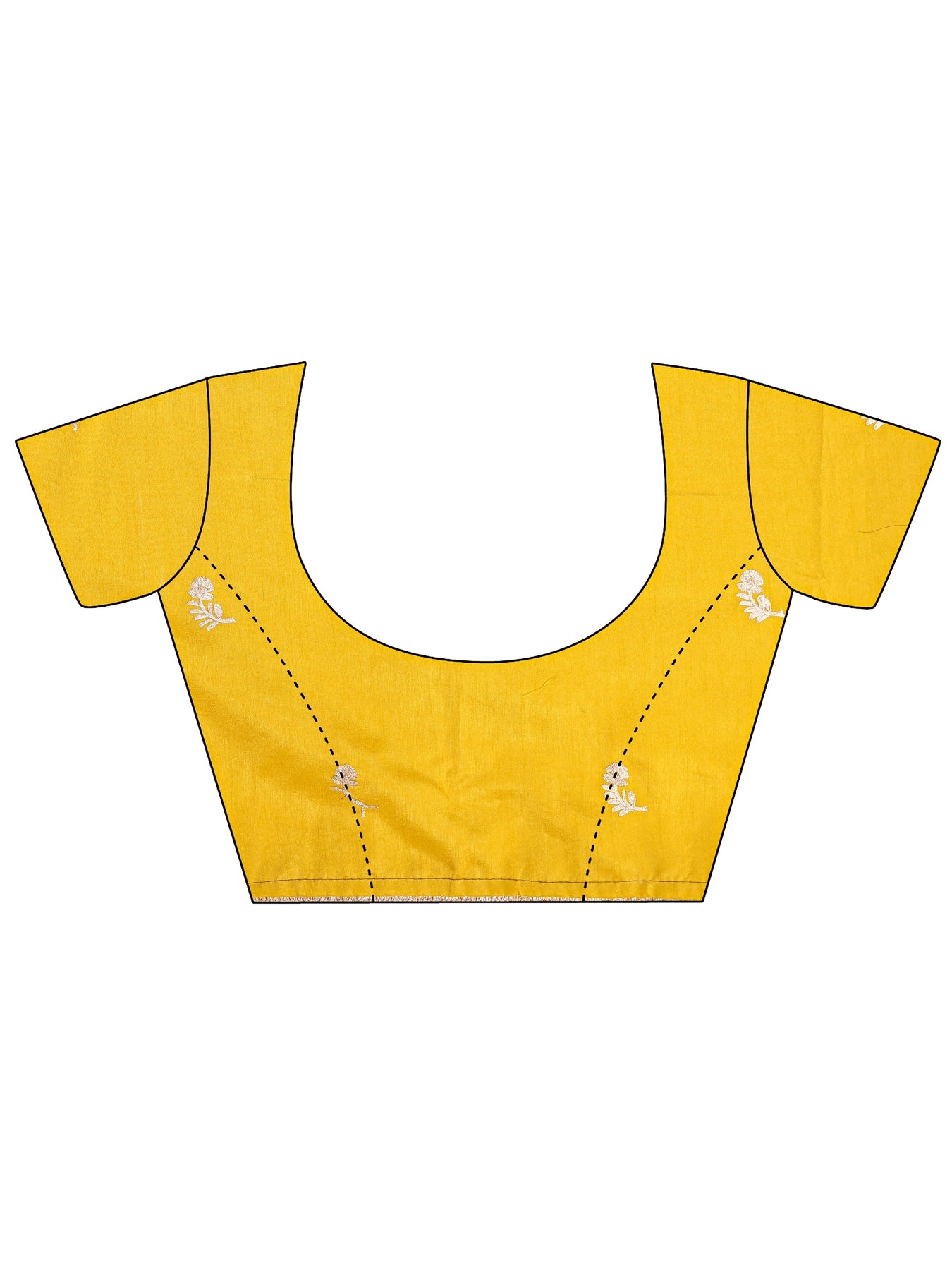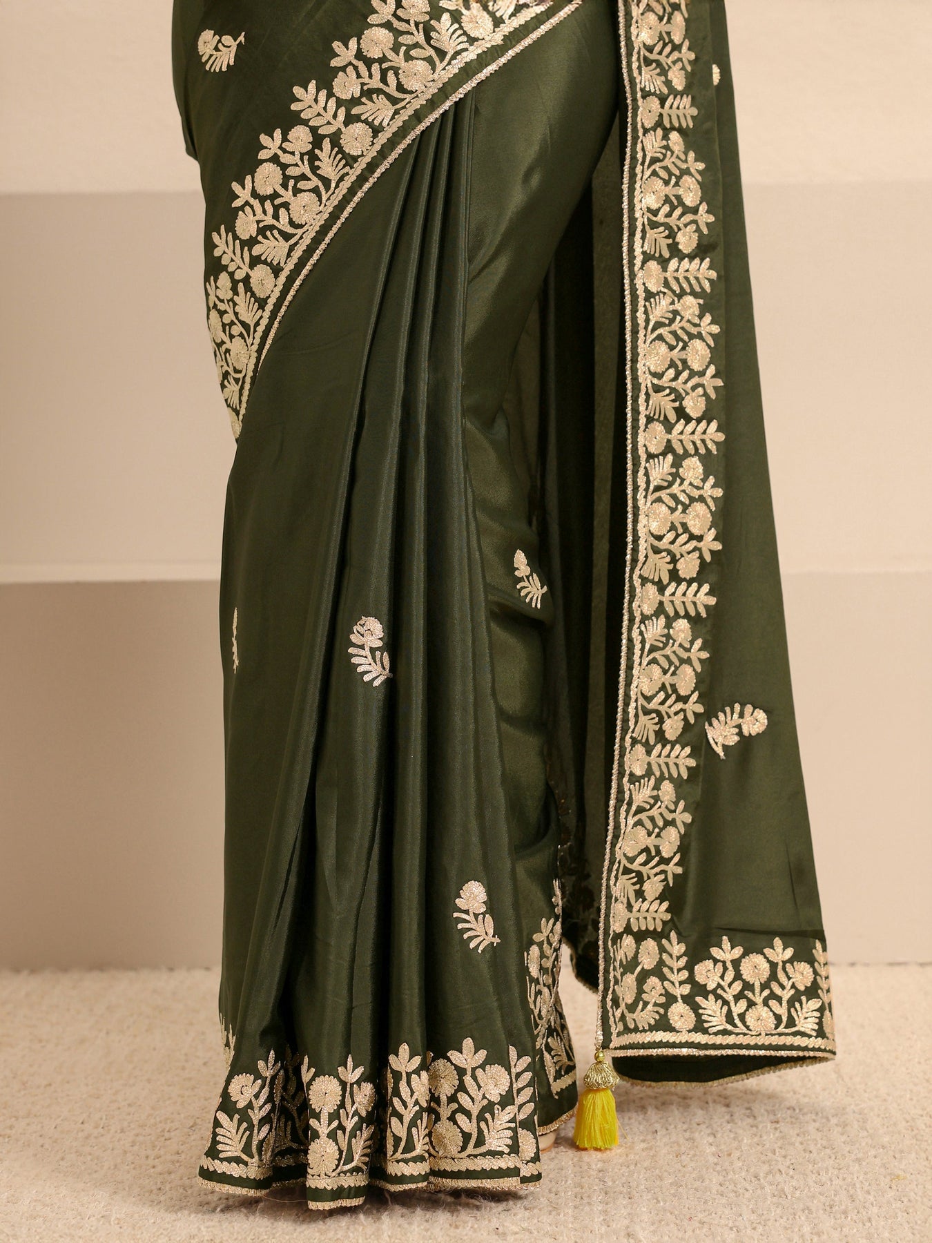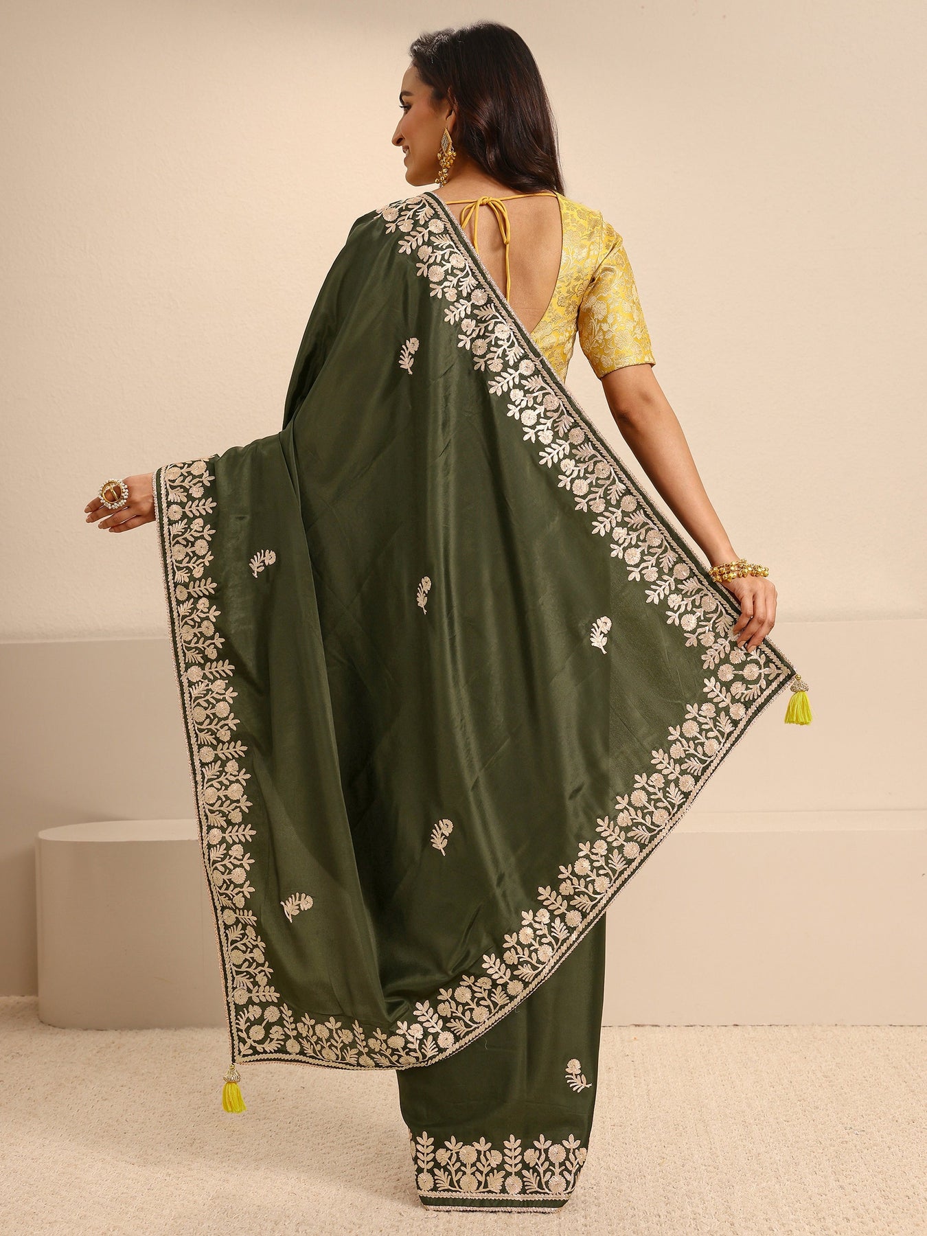 Our green silk-blend saree features a rich, satiny finish adorned with a striking white scalloped embroidery border and delicate floral motifs. Complemented with unstitched blouse, this graceful saree is perfect for festive occasions and traditional celebrations.