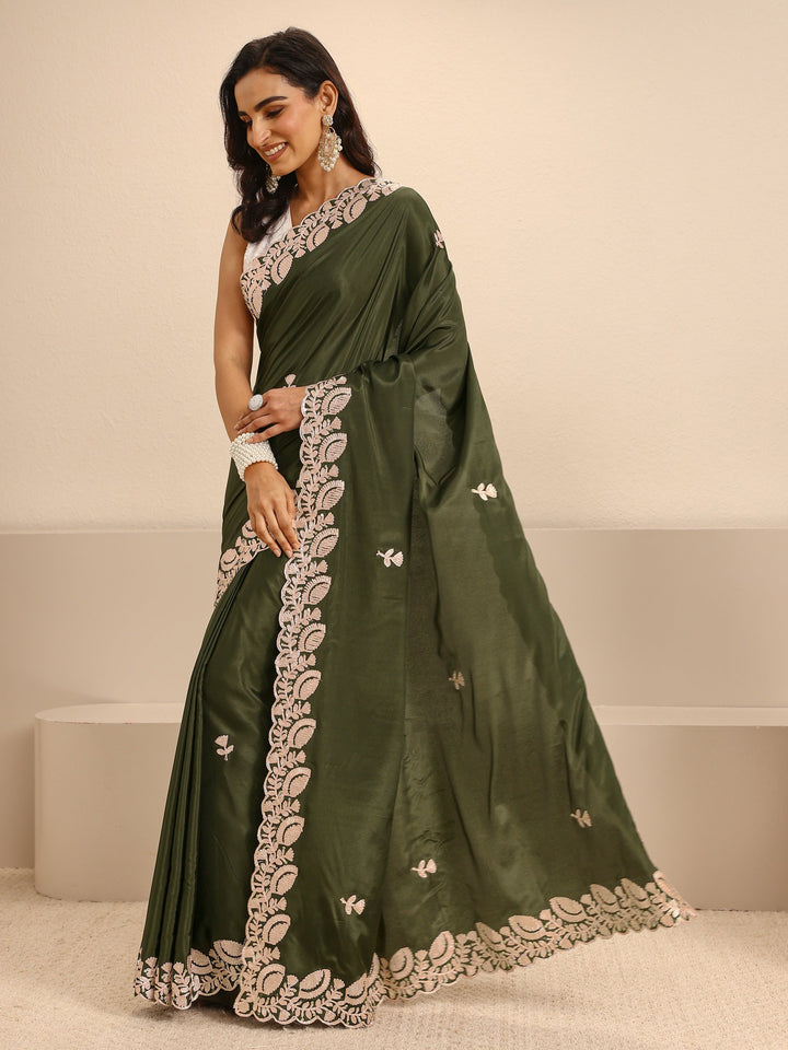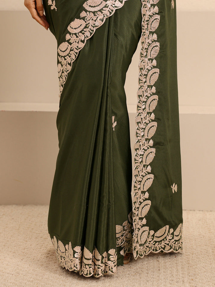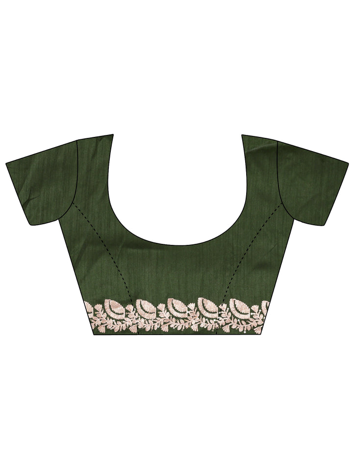 Olive Green Embroidered Silk Blend Saree With Unstitched Blouse Piece