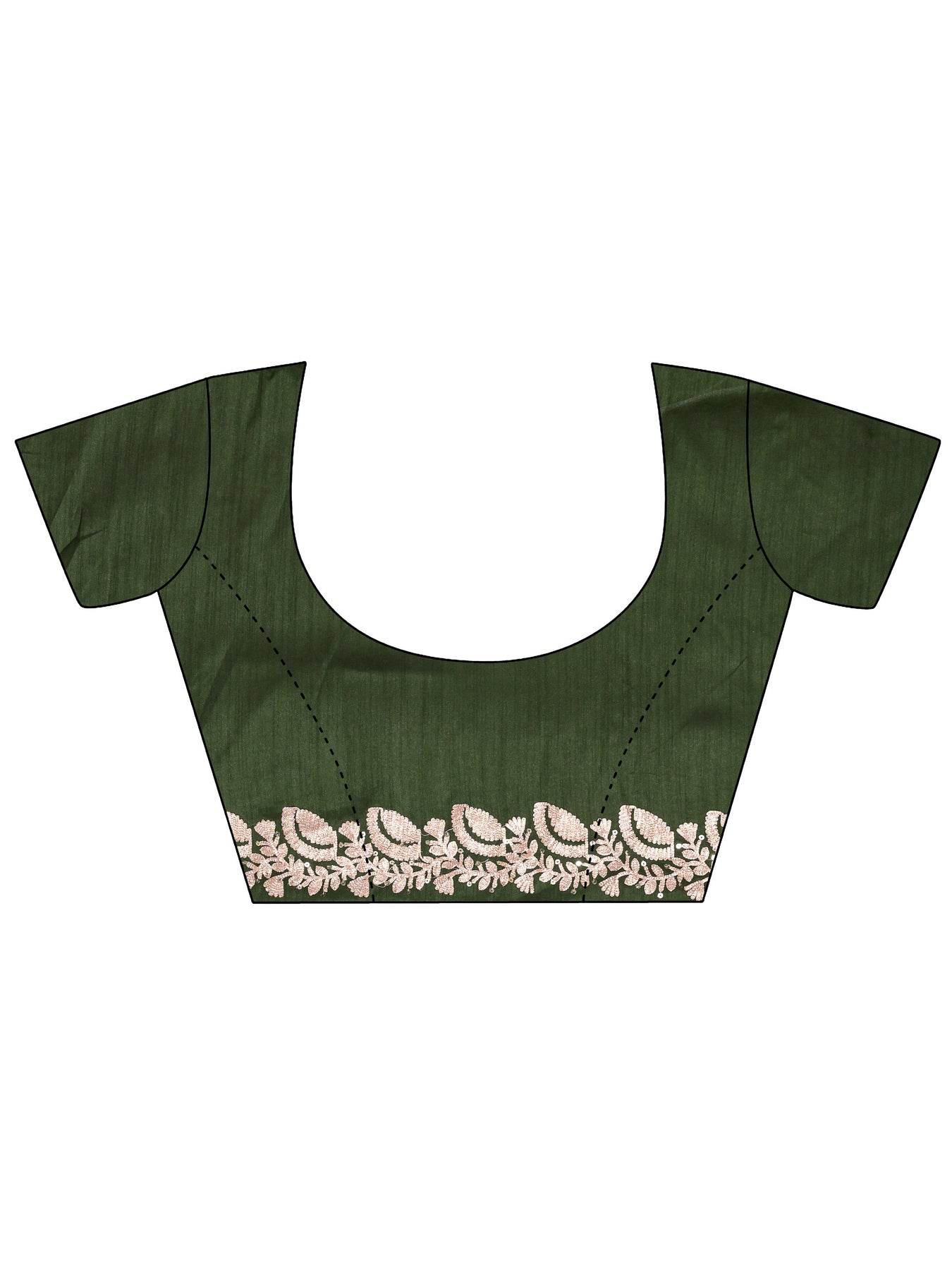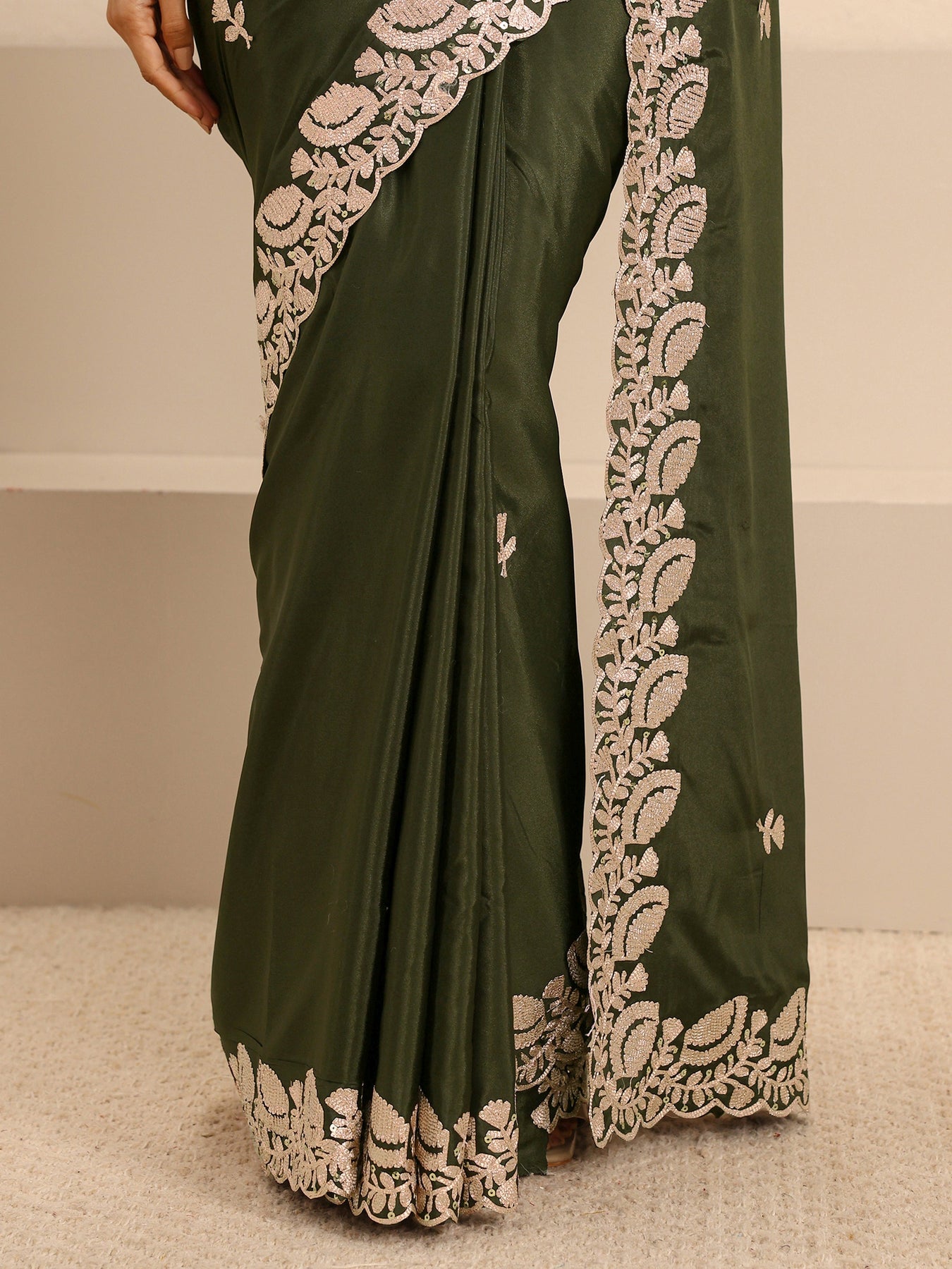 Our green silk-blend saree features a rich, satiny finish adorned with a striking white scalloped embroidery border and delicate floral motifs. Complemented with unstitched blouse, this graceful saree is perfect for festive occasions and traditional celebrations.