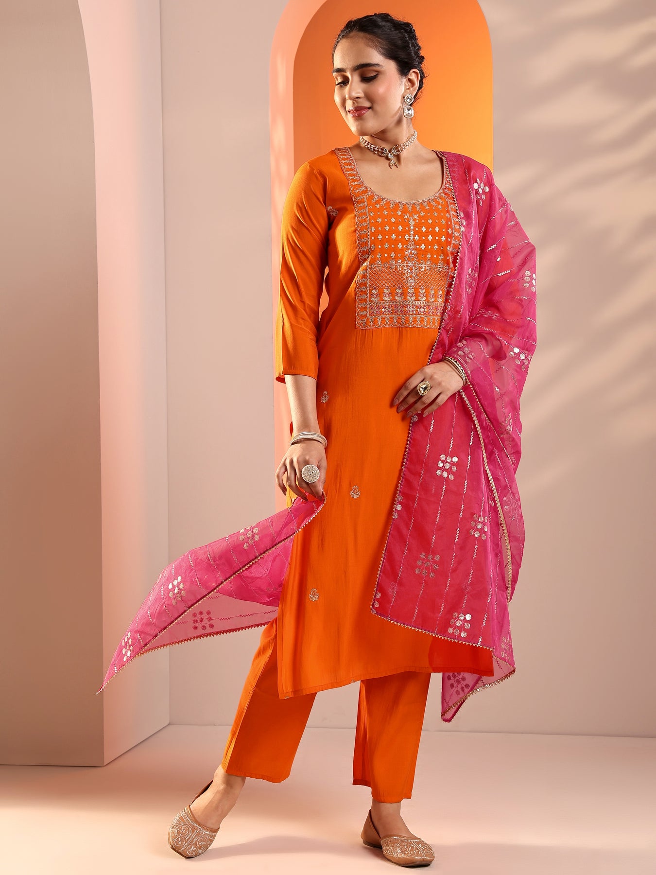 Orange Embellished Silk Blend Straight Suit Set With Dupatta