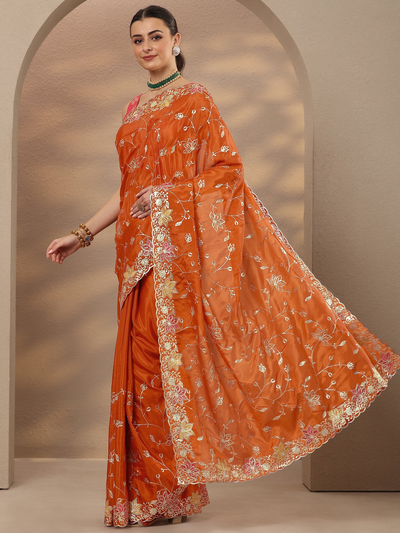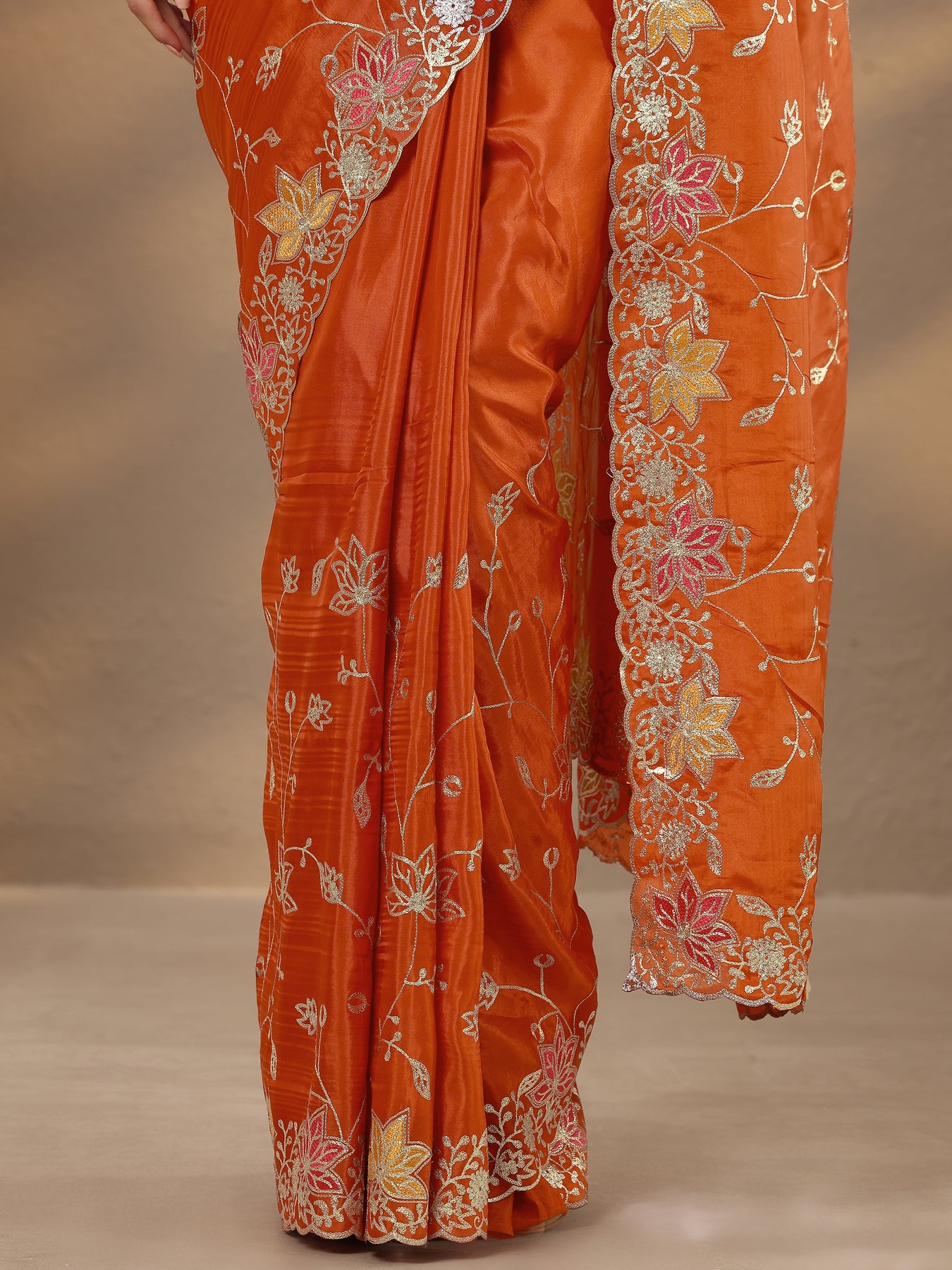 Our Orange Embroidered Silk Blend Saree Features Captivating Floral. Complemented With An Unstitched Blouse Piece. This Charming Saree Is Perfect For Festive Occasions.