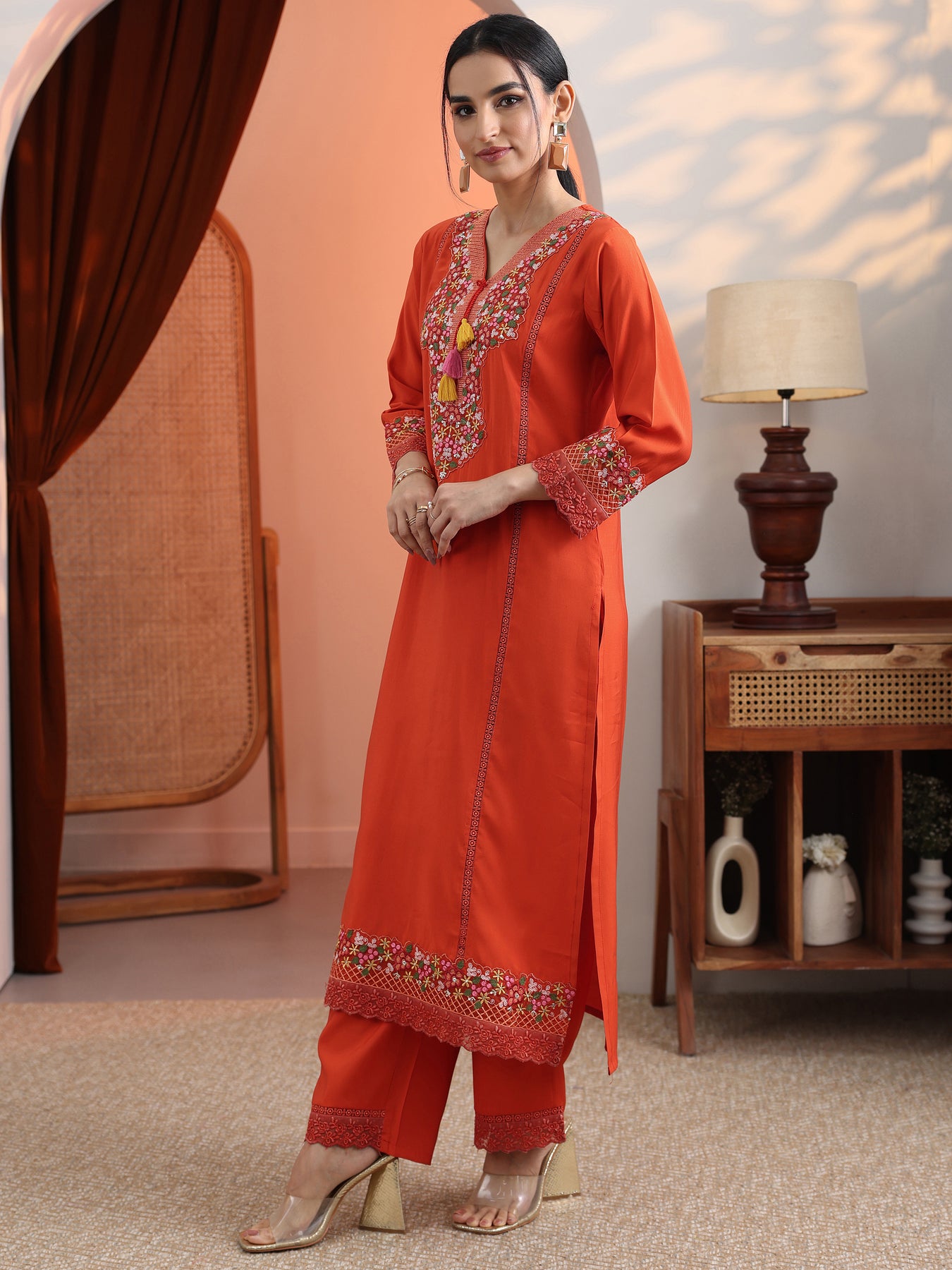 Orange Embroidered Silk Blend Straight Suit Set With Dupatta