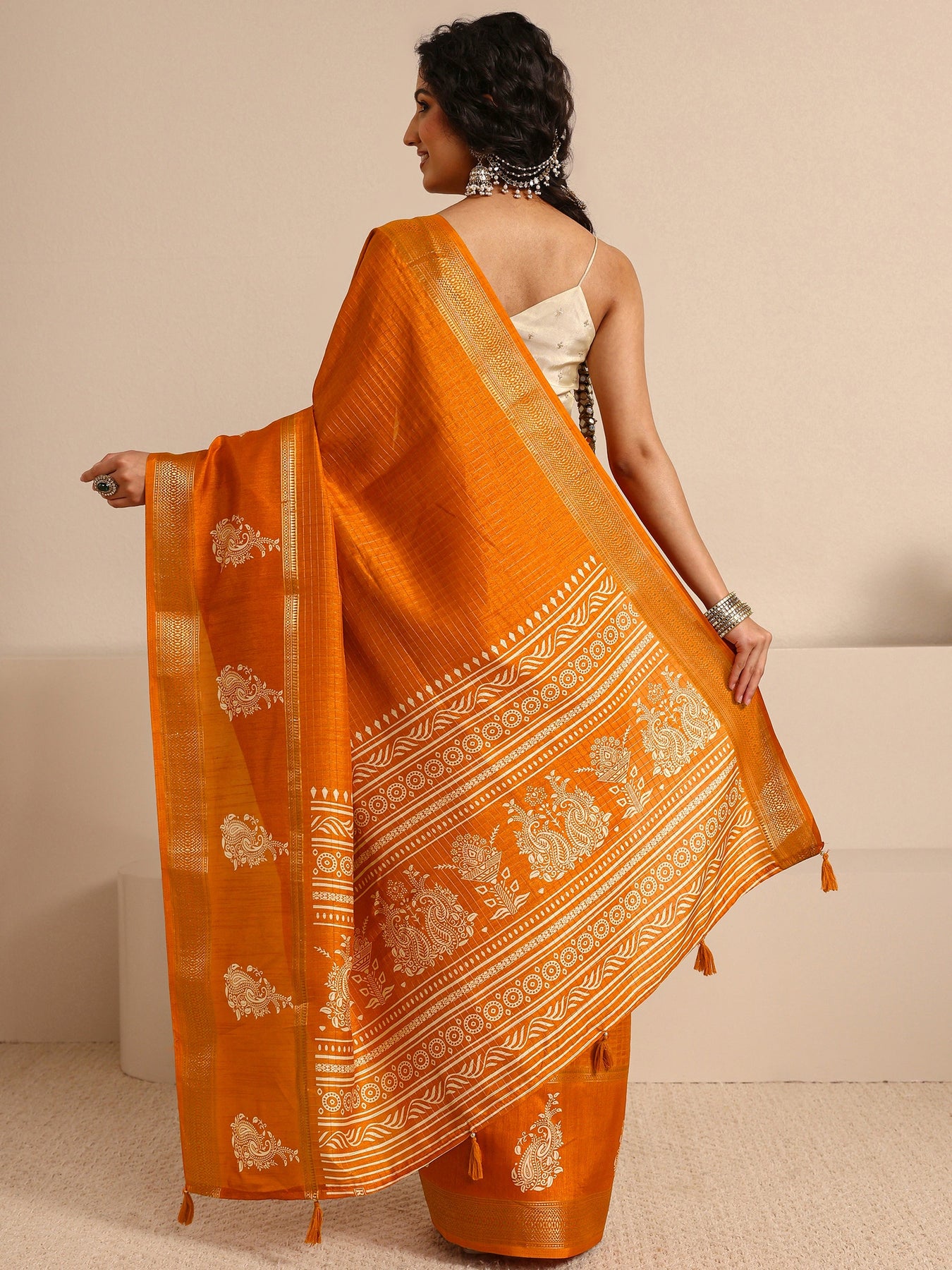 Our orange silk-blend saree features a rich, textured finish adorned with elegant gold zari woven motifs and a traditional paisley-patterned border. Complemented with a unstitched blouse, this graceful saree is perfect for festive occasions and traditional celebrations.
