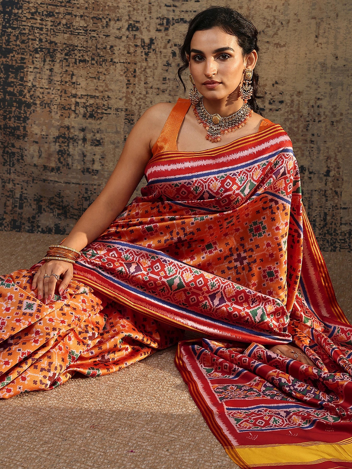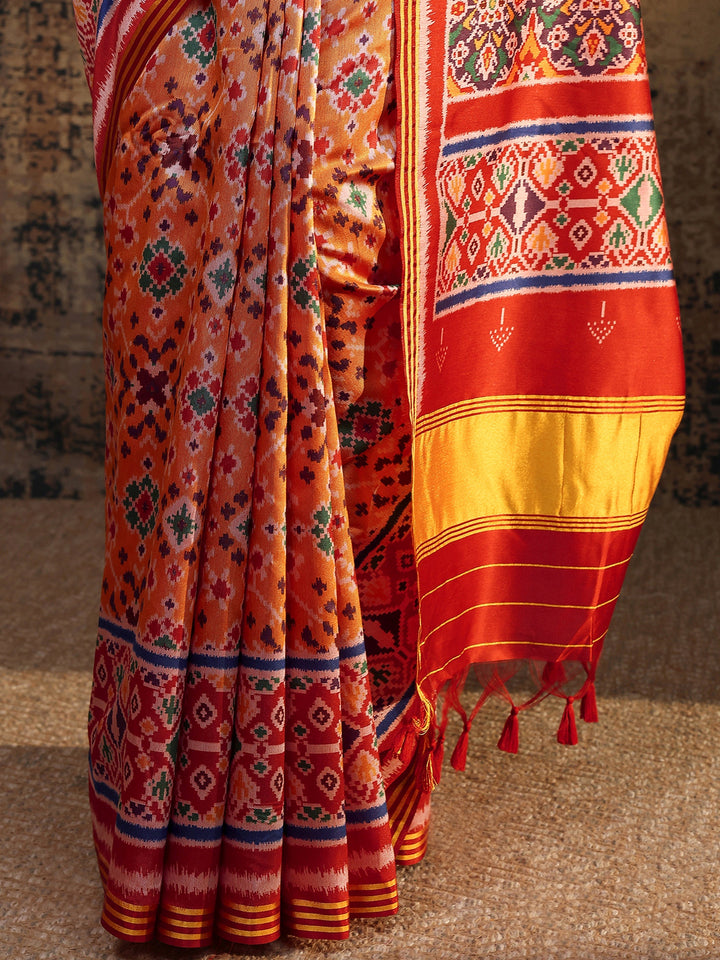 Orange Ikat Printed Silk Saree With Unstitched Blouse Piece