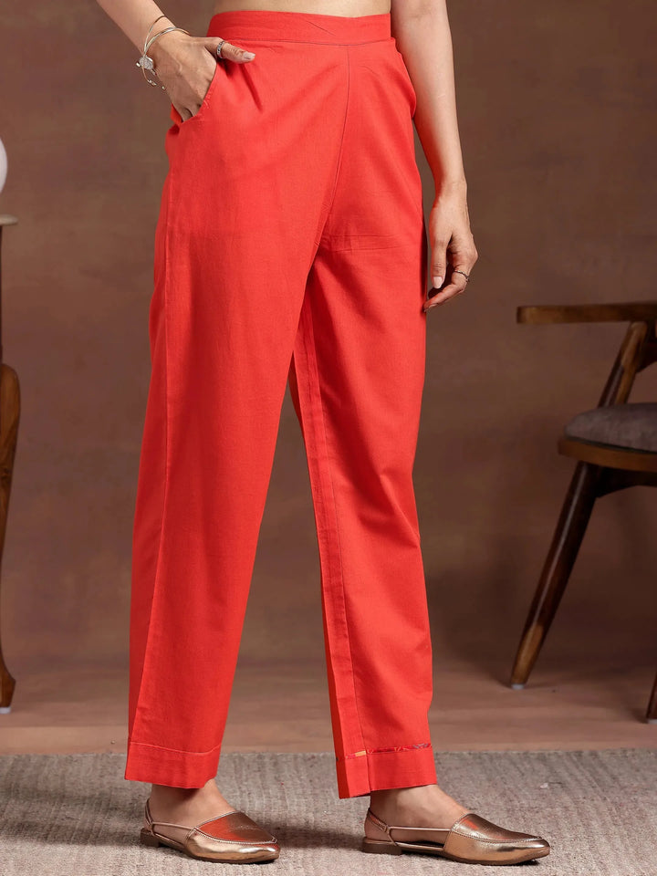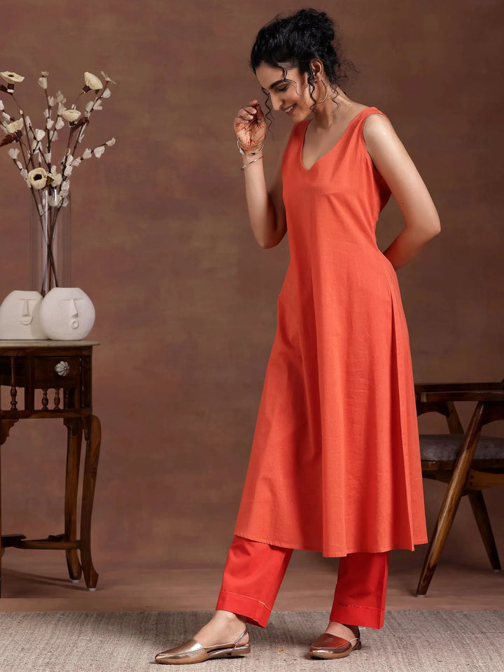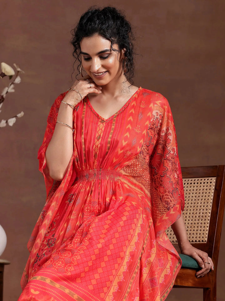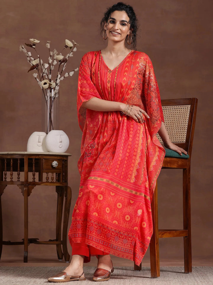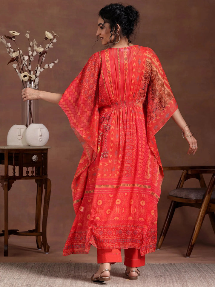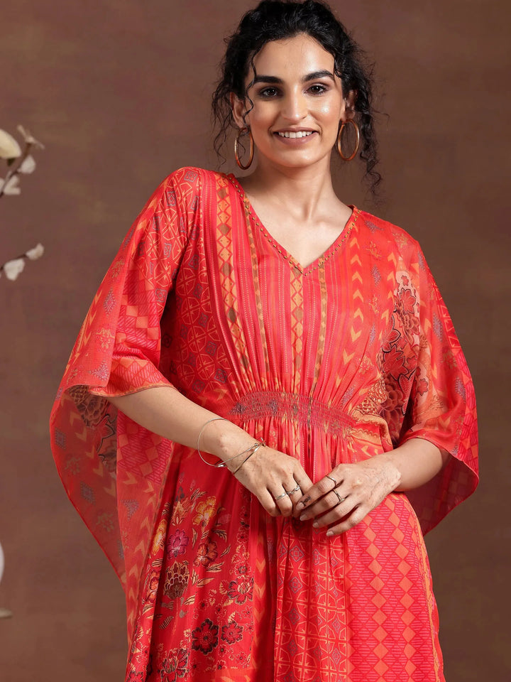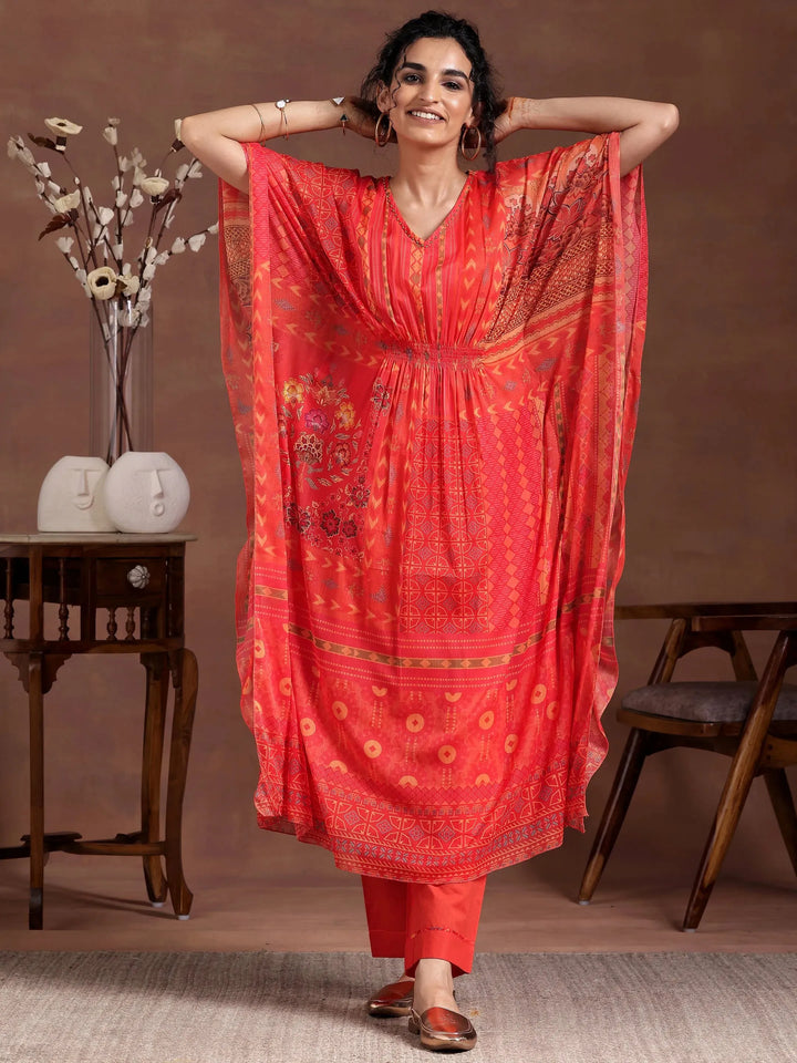 Our 3-piece orange printed co-ord set features a sleeveless cotton long slip and a printed kaftan polyester kurta. Complemented with straight cotton trousers with a partially elasticated waistband and roomy pockets. Highlighted with ethnic motifs prints, beaded accents, and piping-trim detailing, this elegant style is perfect for casual outings.