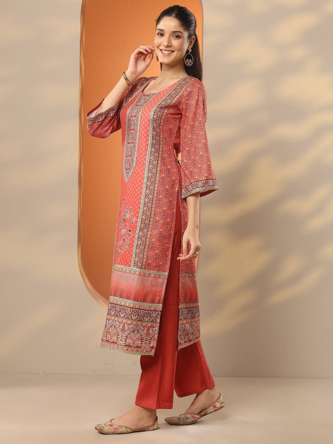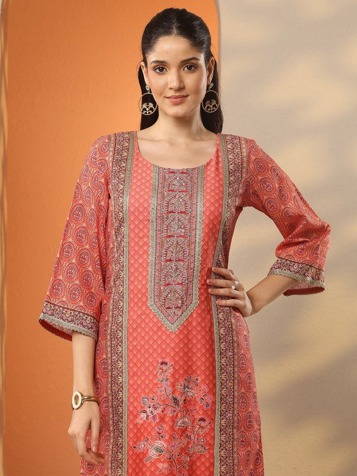 Orange Printed Silk Blend Straight Suit Set With Dupatta