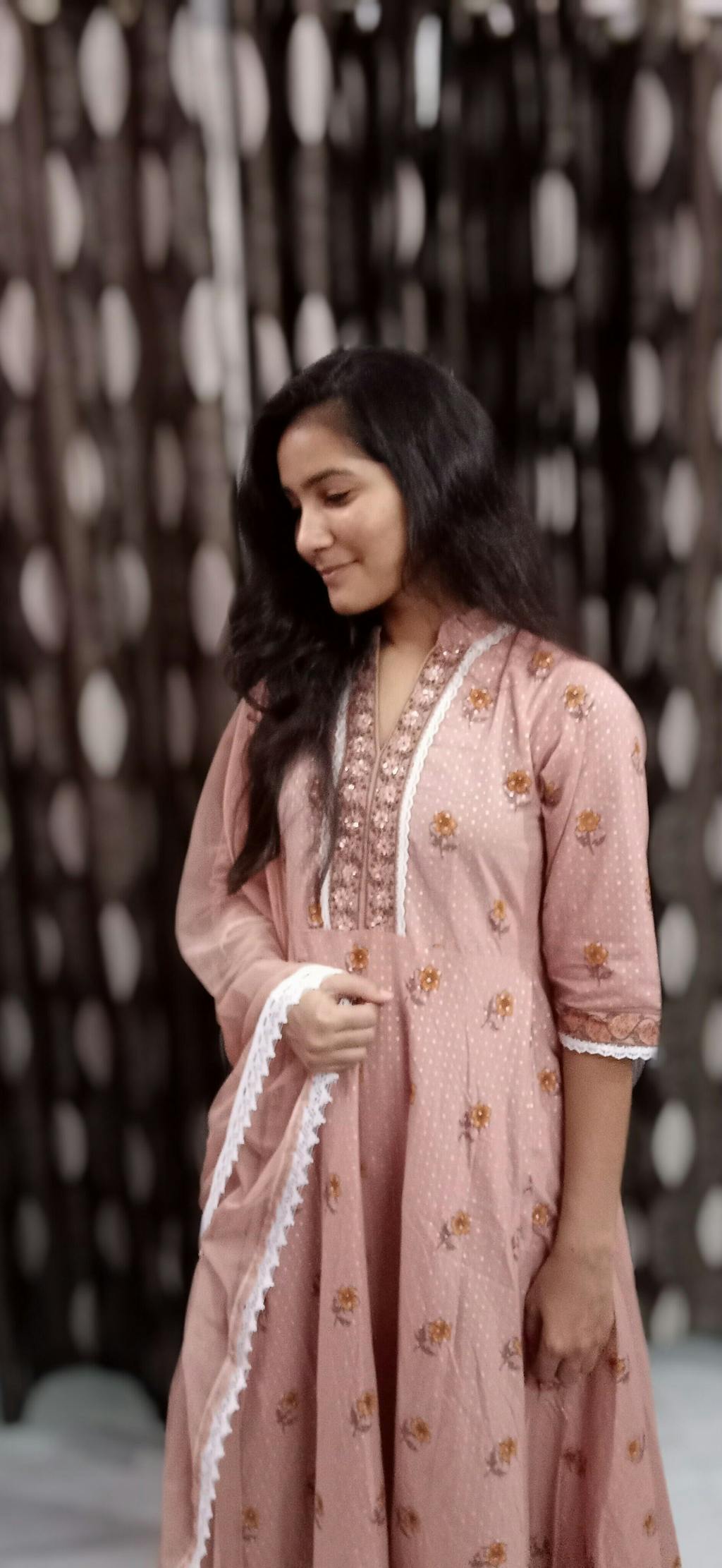 Peach Printed Cotton A-Line Kurta With Palazzos & Dupatta