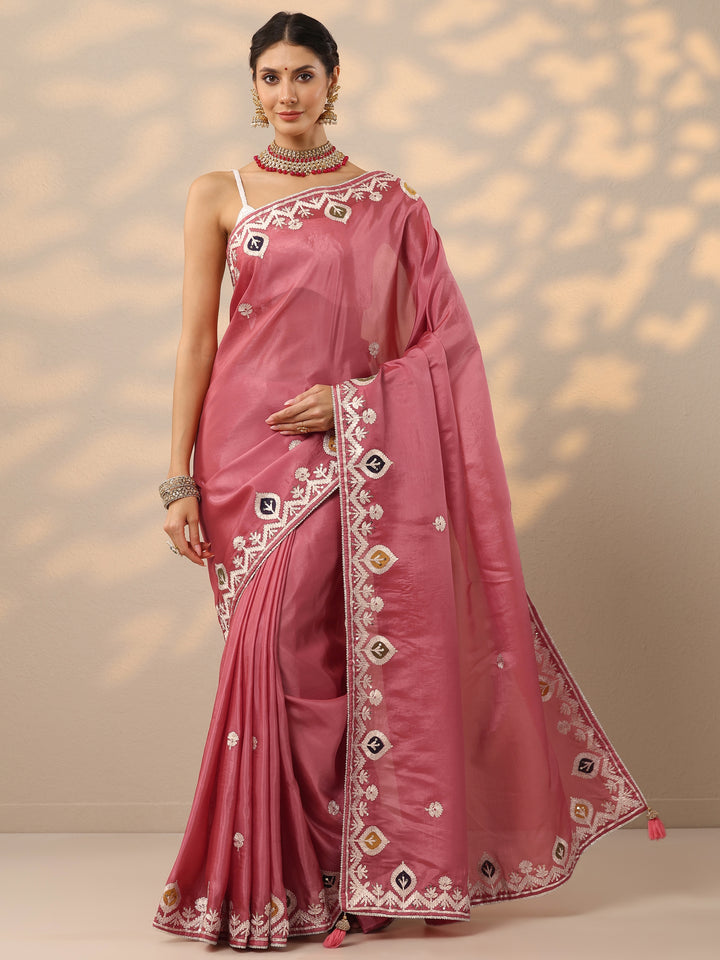 Our Pink Chinon Saree Features Captivating Embroidered Embellishments. Complemented With An Unstitched Blouse Piece. This Charming Saree Is Perfect For Festive Occasions