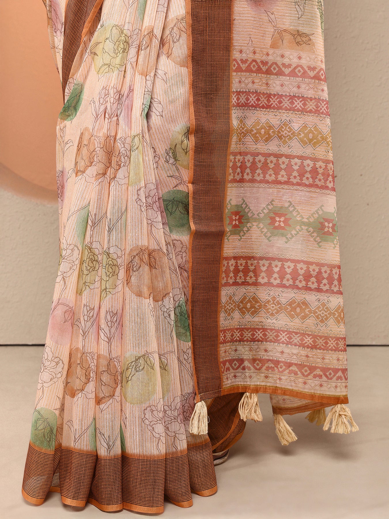 Peach Printed Linen Saree With Unstitched Blouse Piece