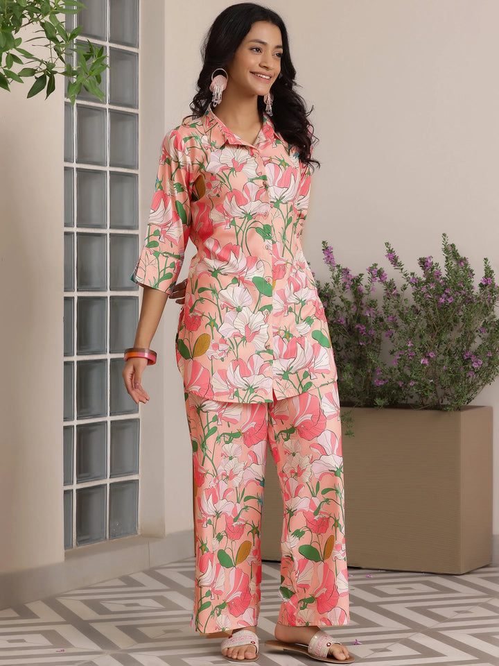 Our 2-piece peach printed silk blend co-ord set features a kurti with a shirt collar with buttoned-down detailing and three-quarter sleeves with slits. Complemented with matching trousers with a partially elasticated waistband and roomy pockets. Adorned with floral prints and stylish buttons, this style is perfect for casual outings.