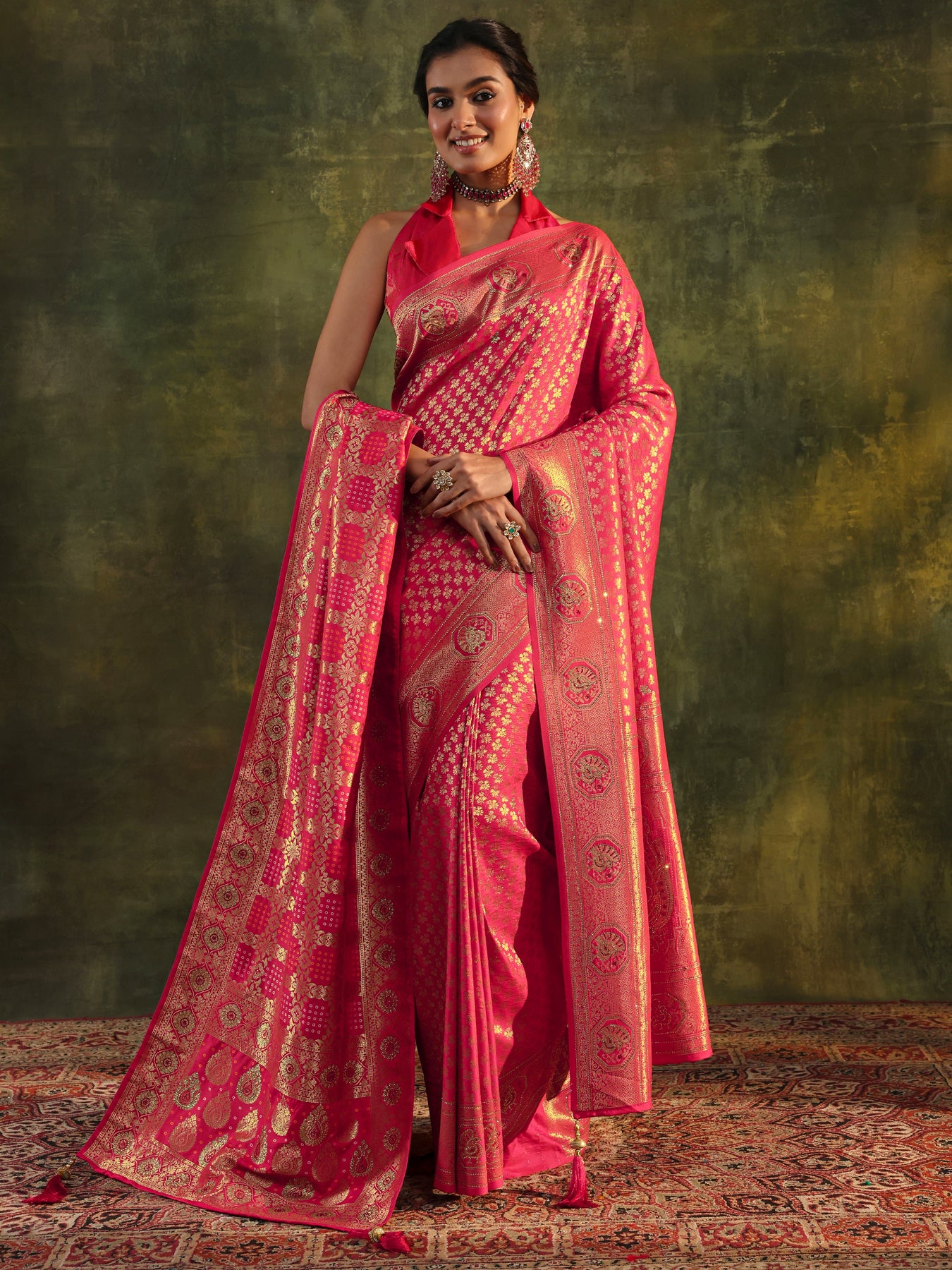 Pink Banarasi Silk Saree With Unstitched Blouse And Dupatta