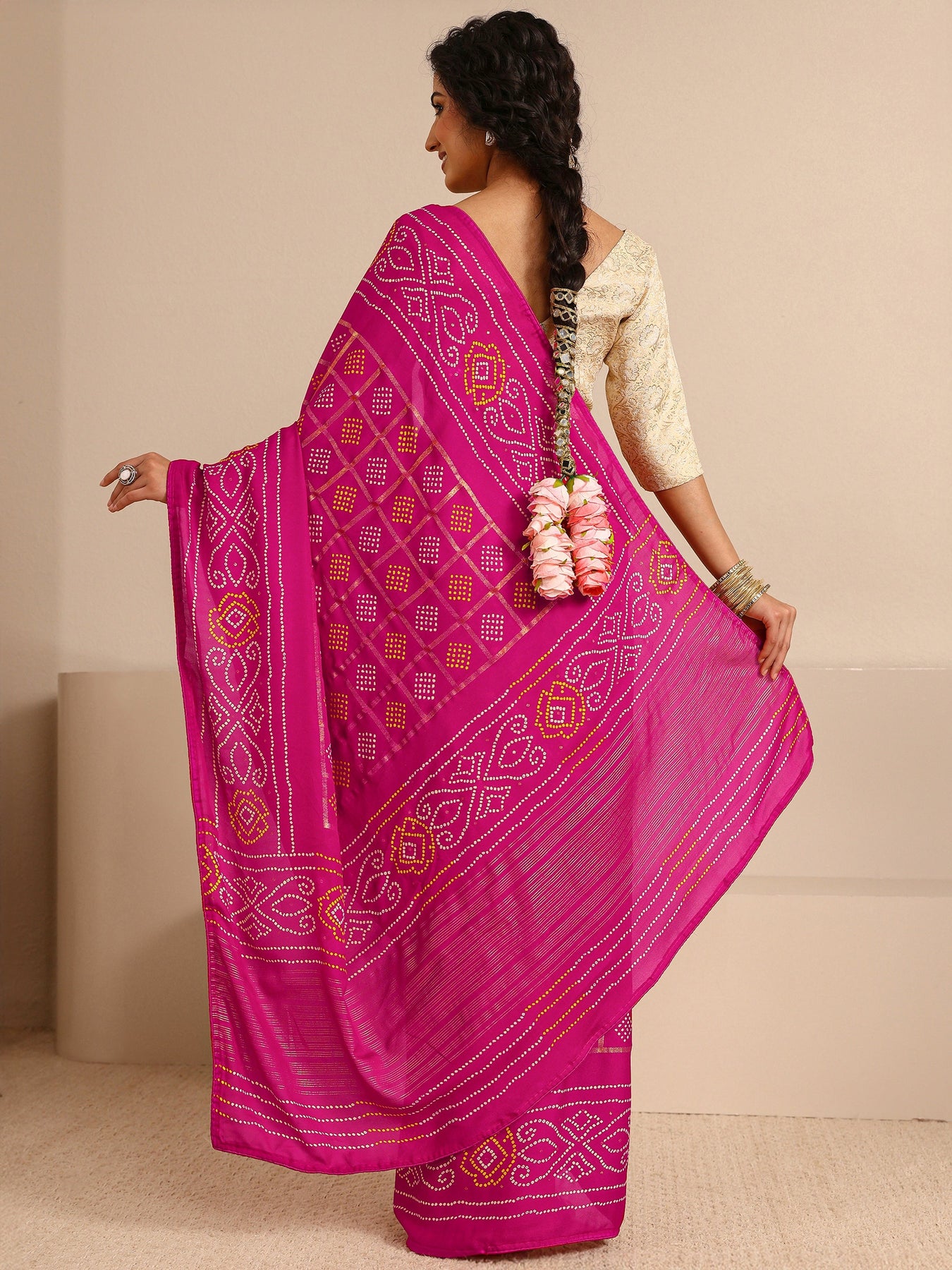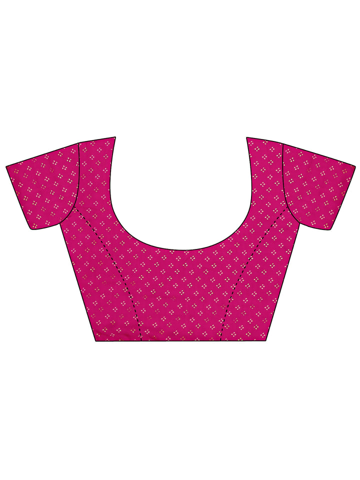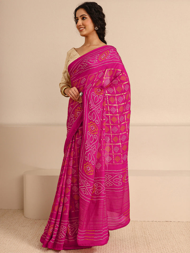 Our vibrant magenta pink silk-blend saree features a traditional Bandhani-inspired print with intricate geometric patterns and gold-toned accents. Complemented with unstitched blouse, this graceful saree is perfect for festive occasions and traditional celebrations.