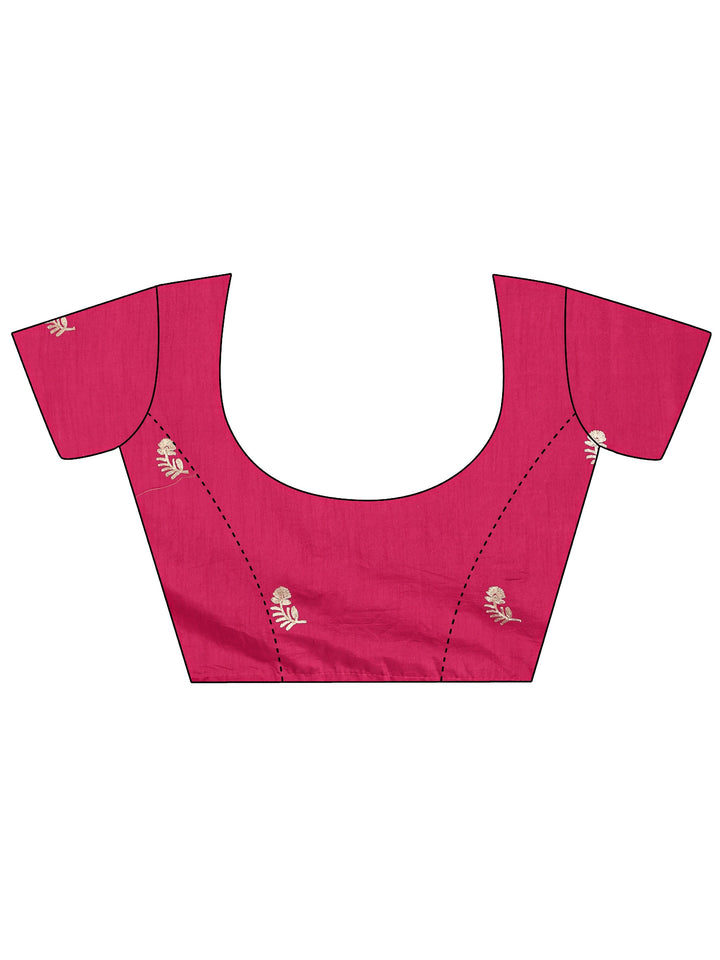 Our pink silk-blend saree features a rich, satiny finish adorned with a striking white scalloped embroidery border and delicate floral motifs. Complemented with unstitched blouse, this graceful saree is perfect for festive occasions and traditional celebrations.