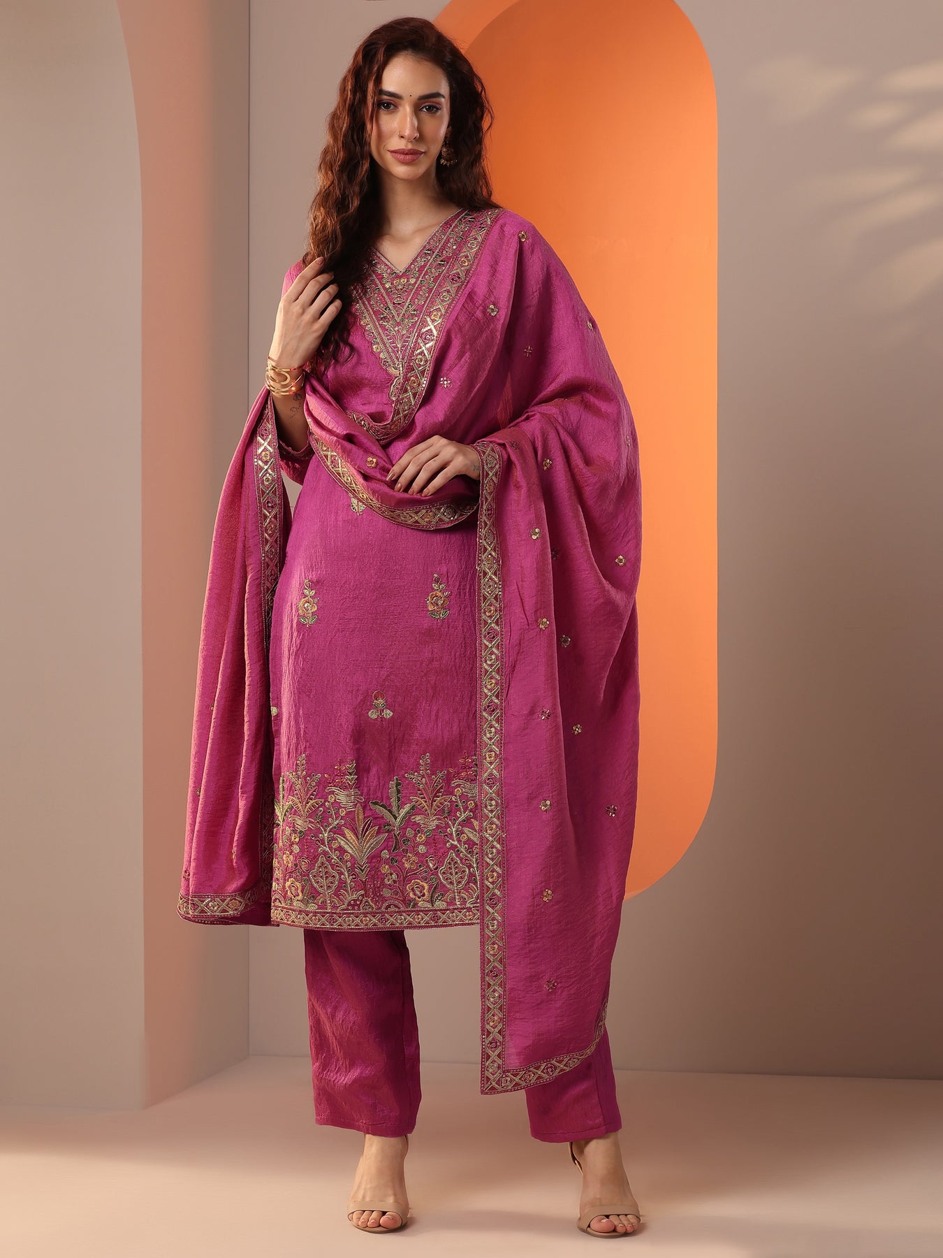 Pink Embellished Silk Blend Straight Suit Set With Dupatta