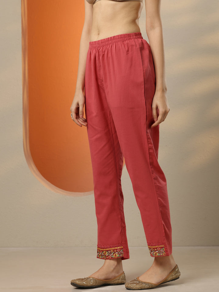 Our 3-piece Red Cotton Straight-Fit Kurta Set features a V-Neckline, Regular Sleeves, and statement yoke. Complemented with Straight Pants with a Partially Elasticated waistband and 2 pockets, and an Embroidered dupatta. Adorned with Floral Embroidered, this style is perfect for Dark Festive.