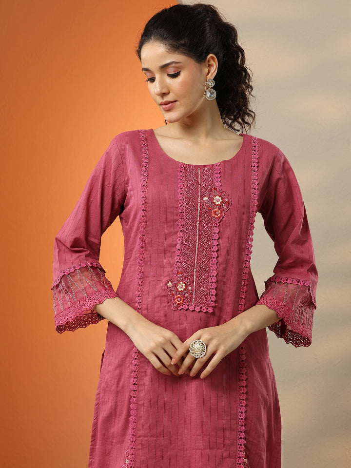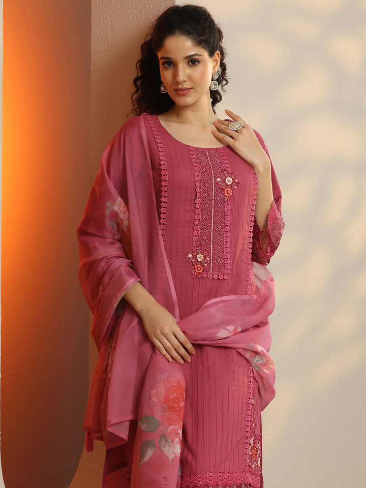 Pink Embroidered Cotton Straight Suit Set With Dupatta