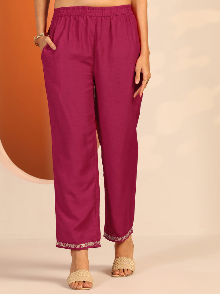 Our 3-piece Magenta Silk blend Anarkali Kurta Set features a V-Neckline, Regular Sleeves, and statement yoke. Complemented with Straight Pants with a Partially Elasticated waistband and 2 pockets, and an Embroidered dupatta. Adorned with Embroidered embellishments, this style is perfect for Festive wear.
