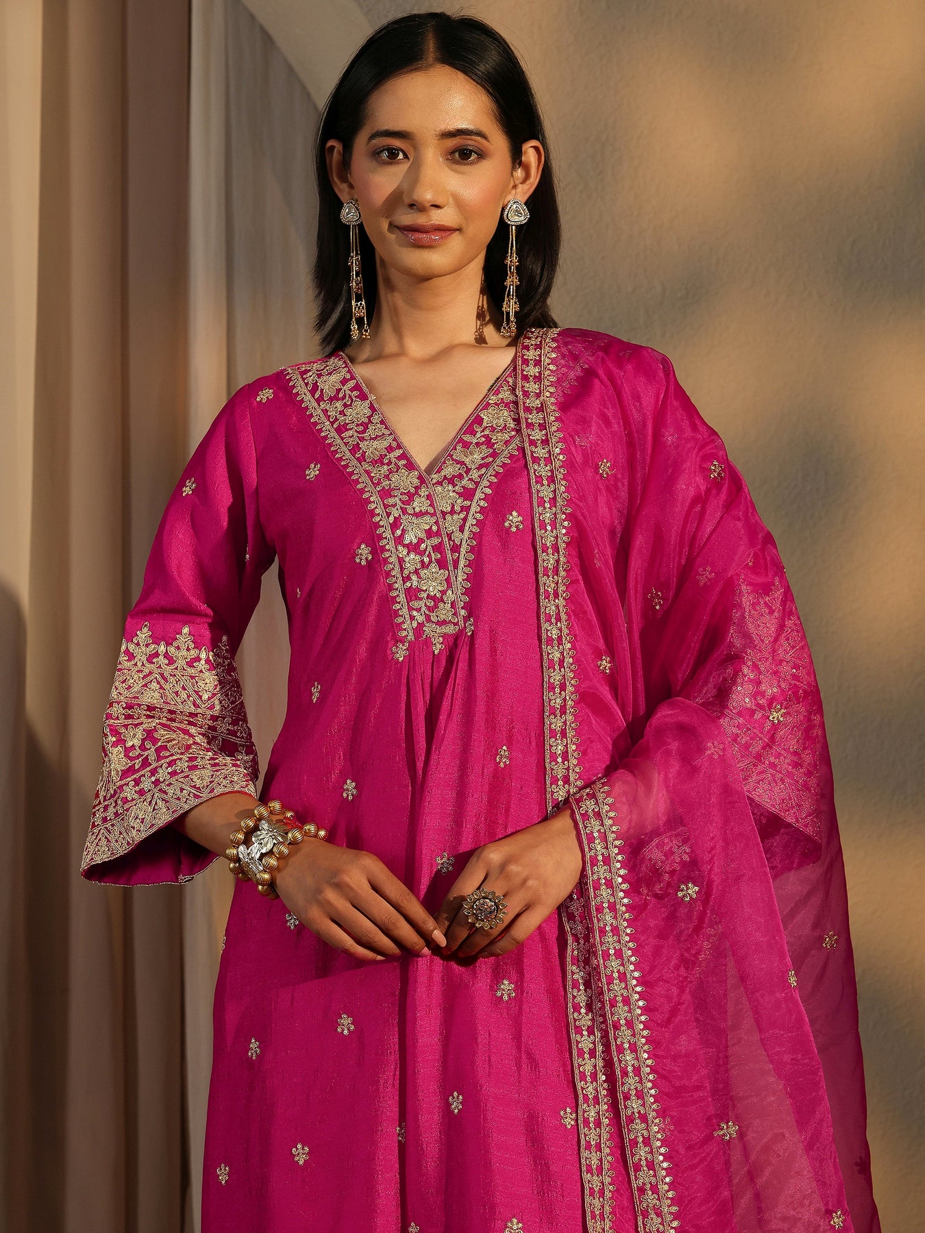 Our 3-piece Pink Silk blend A-line Kurta Set features a V-Neckline, Bell Sleeves, and statement yoke. Complemented with Lining and Straight Pants with a Partially Elasticated waistband and 2 pockets, and an Embroidered dupatta. Adorned with ethnic motif embroidered, this style is perfect for Festive occasions.