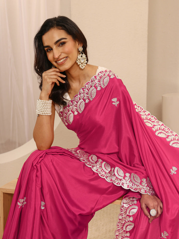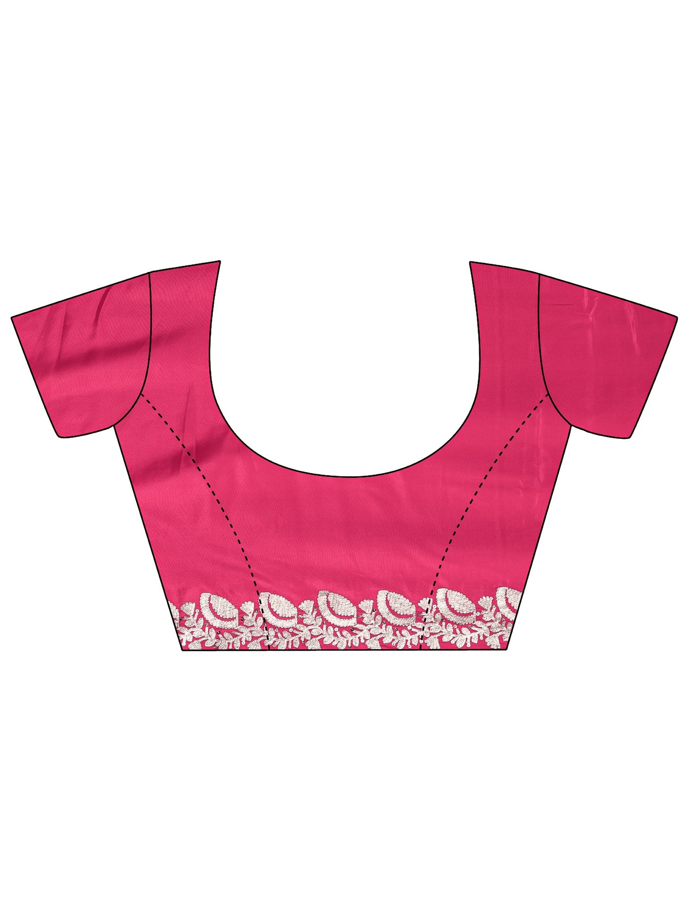 Our pink silk-blend saree features a rich, satiny finish adorned with a striking white scalloped embroidery border and delicate floral motifs. Complemented with unstitched blouse, this graceful saree is perfect for festive occasions and traditional celebrations.