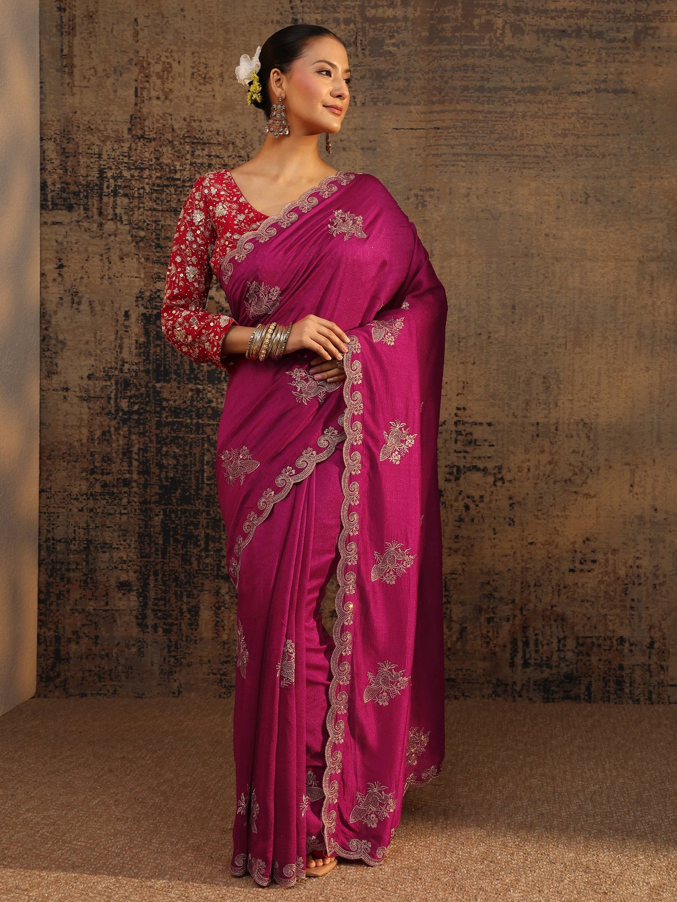Pink Floral Embroidered Silk Blend Saree With Unstitched Blouse Piece