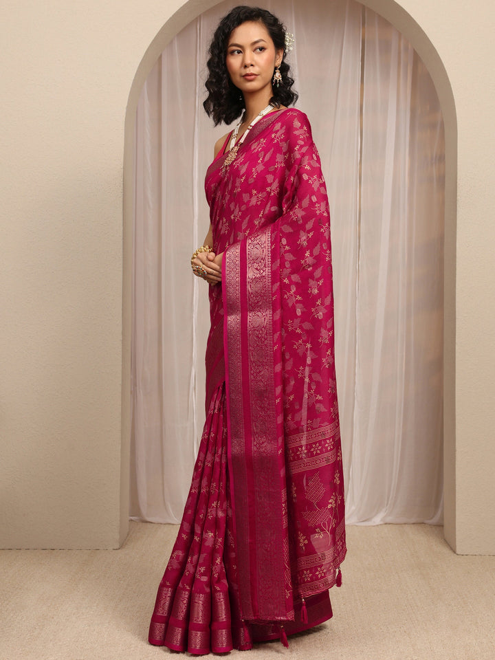 Pink Floral Printed Silk Blend Saree With Unstitched Blouse Piece