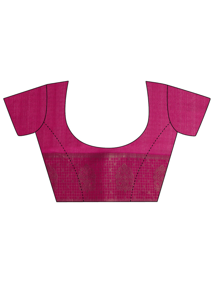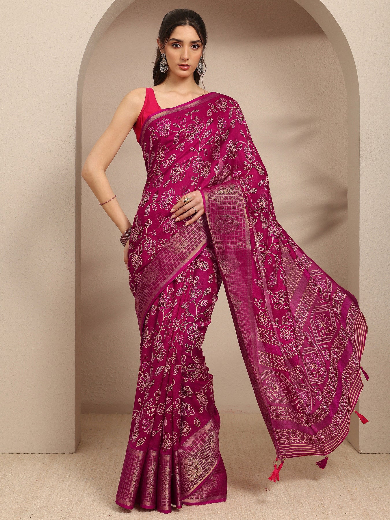 Our magenta printed silk blend saree features a captivating floral design inspired by traditional motifs. Complemented with a blouse piece. This charming saree is perfect for festive occasions.