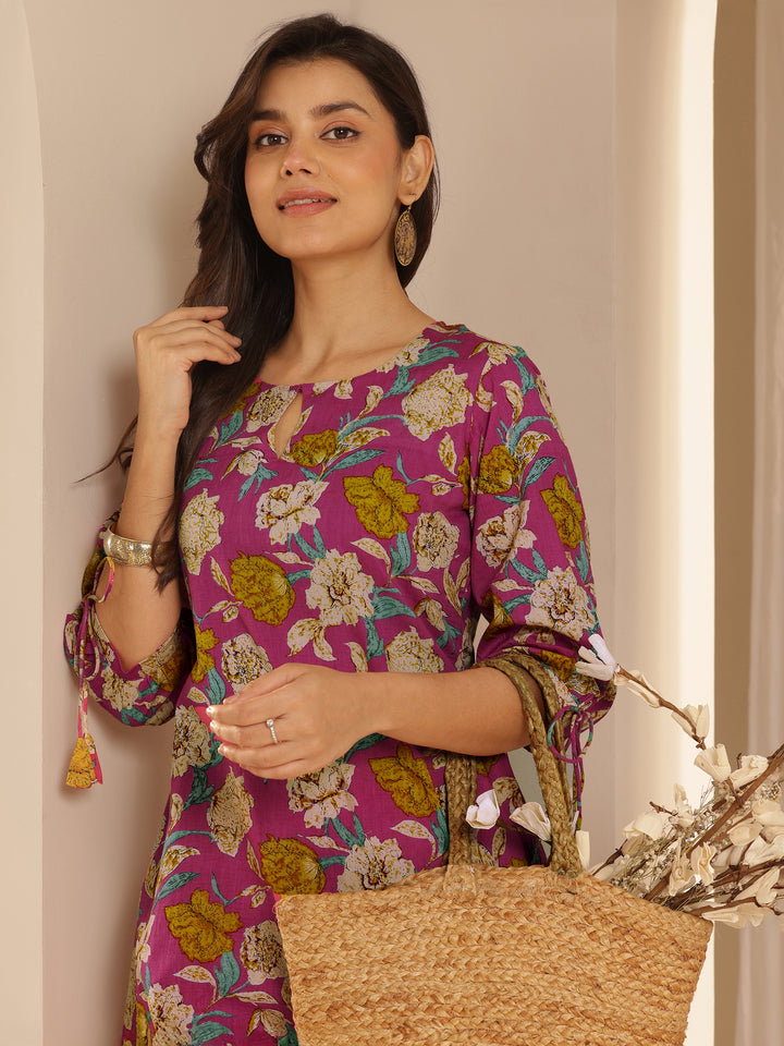 Our 2-piece pink printed cotton kurta set features a straight-fit kurta with a keyhole neckline and three-quarter bishop sleeves. Complemented with palazzo pants with a partially elasticated waistband and roomy pockets. Highlighted with captivating floral prints and dori detailing, this style is perfect for elevated everyday wear.
