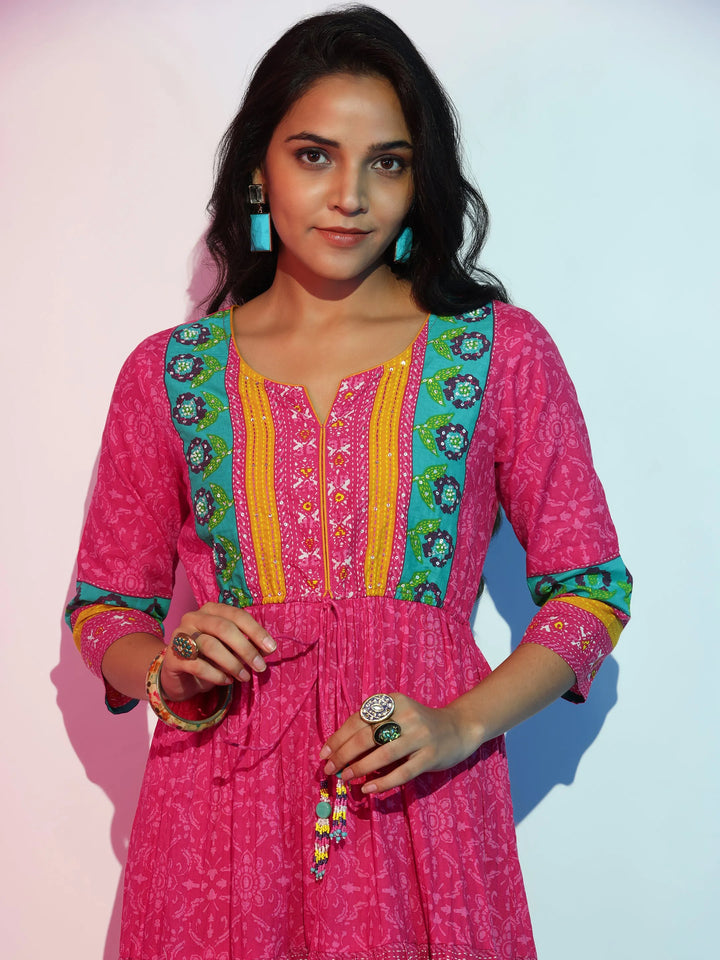 Our pink printed cotton fit and flare dress features a notched neckline, three-quarter sleeves, and a flared hemline. Highlighted with ethnic motifs prints, this style is perfect for casual outings.