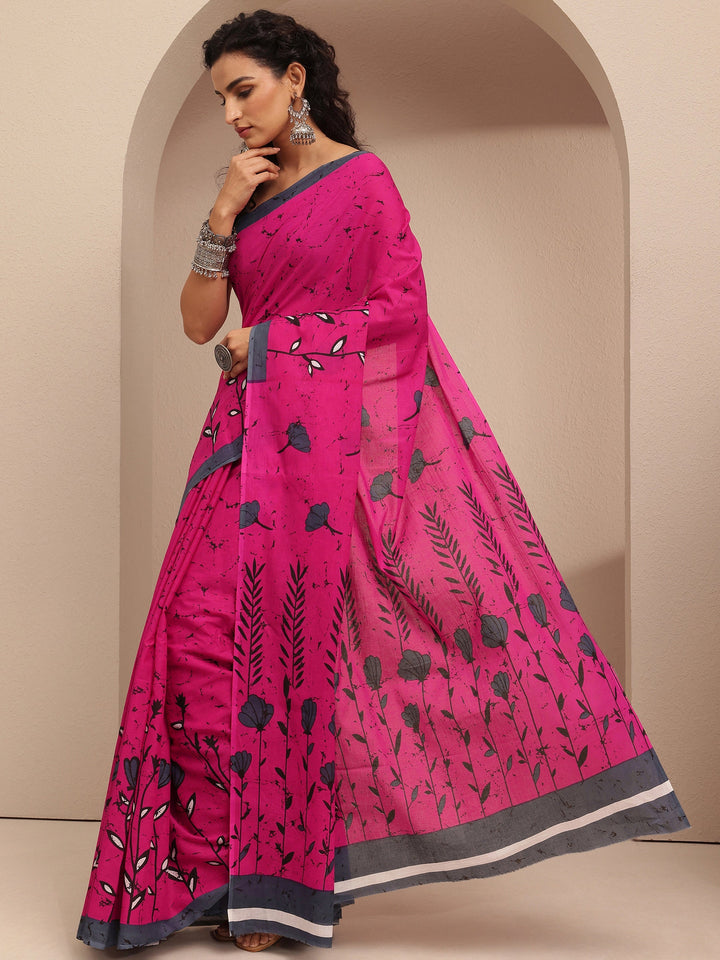 Pink Printed Cotton Saree With Unstitched Blouse Piece
