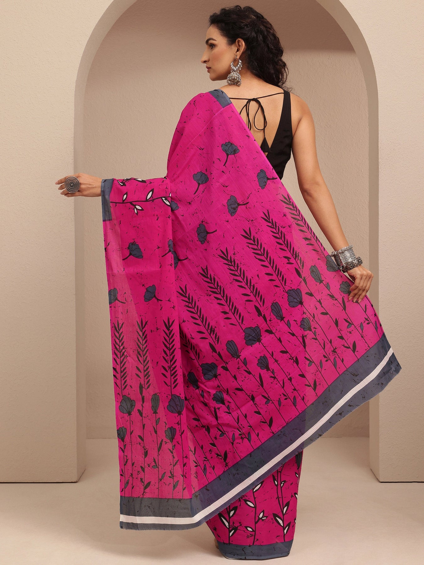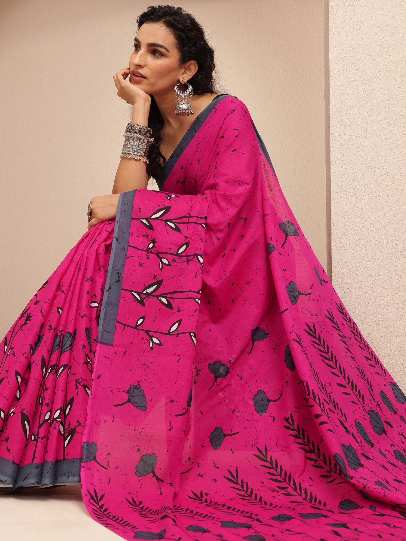 Our pink printed cotton saree features captivating floral print. Complemented with an unstitched Blouse Piece. This charming saree is perfect for festive occasions