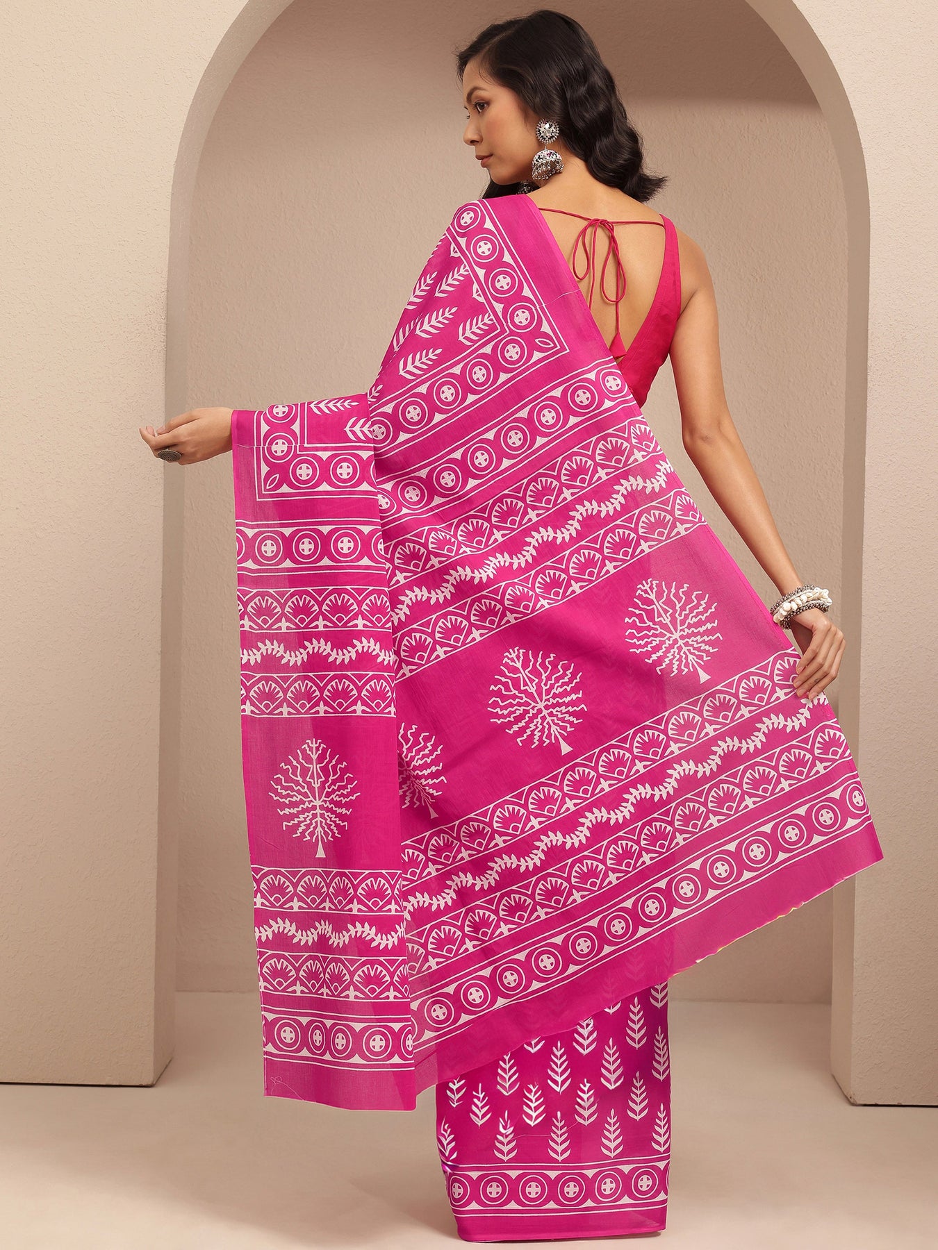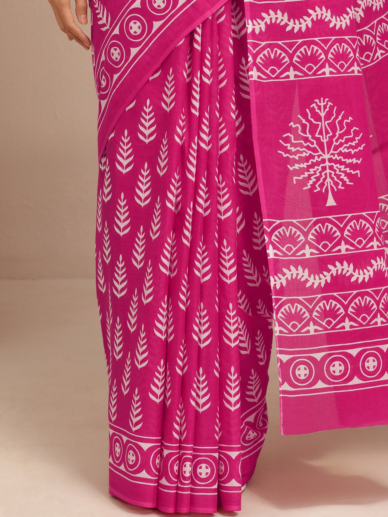 Pink Printed Cotton Saree With Unstitched Blouse Piece