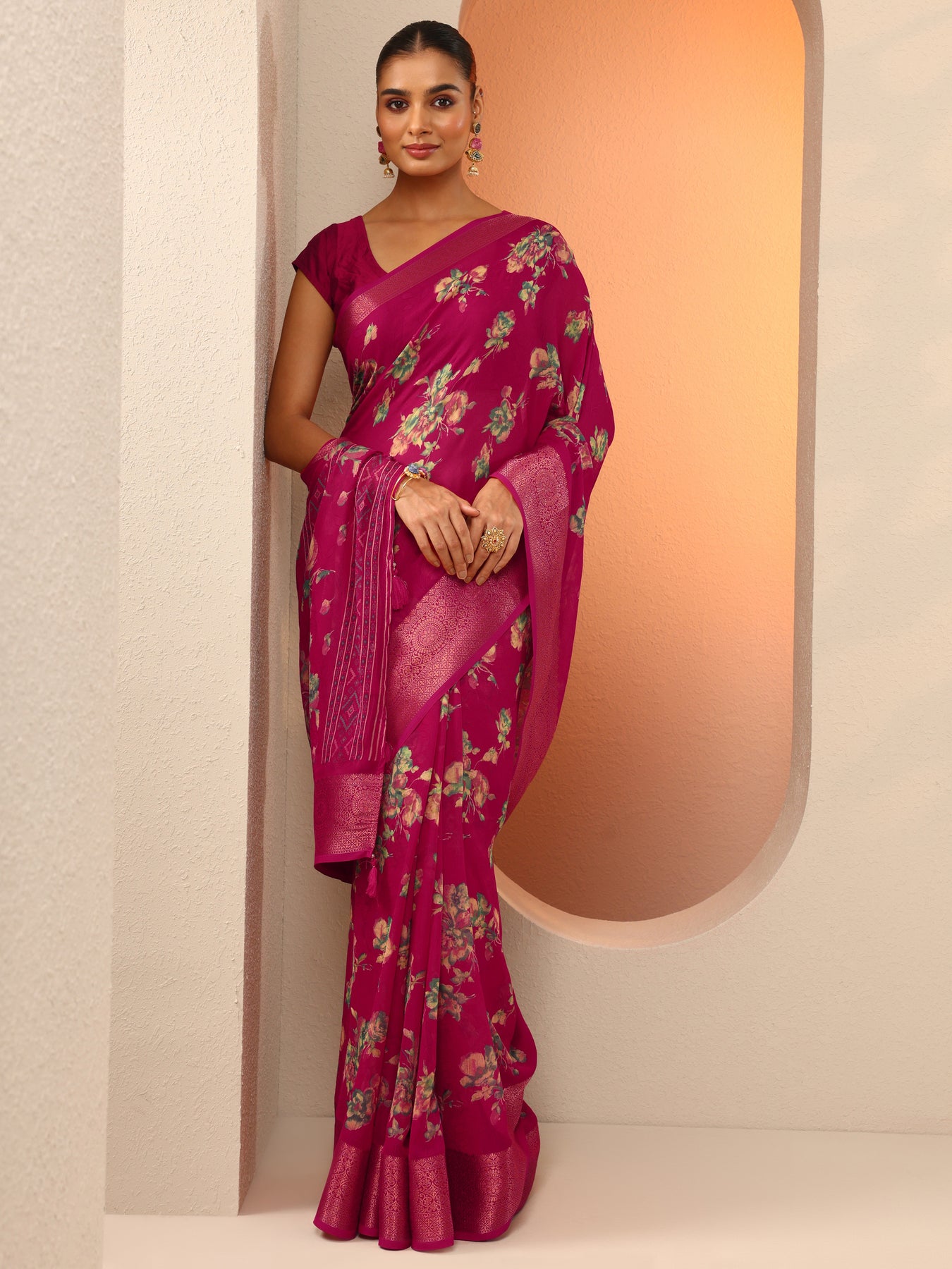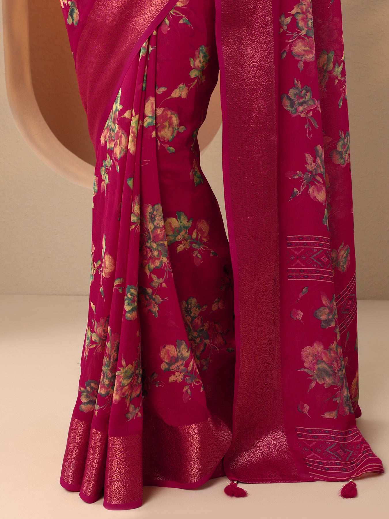 Our Magenta Printed Georgette Saree Features Captivating Floral Print. Complemented With An Unstitched Blouse Piece. This Charming Saree Is Perfect For Festive Wear