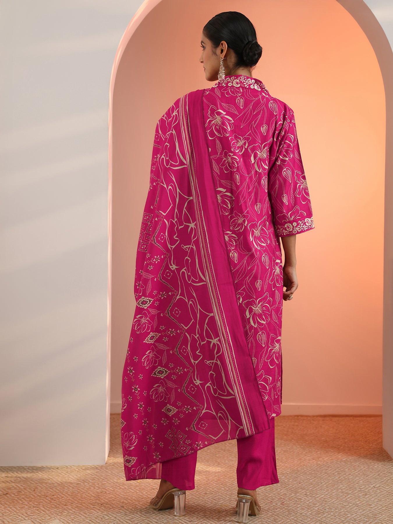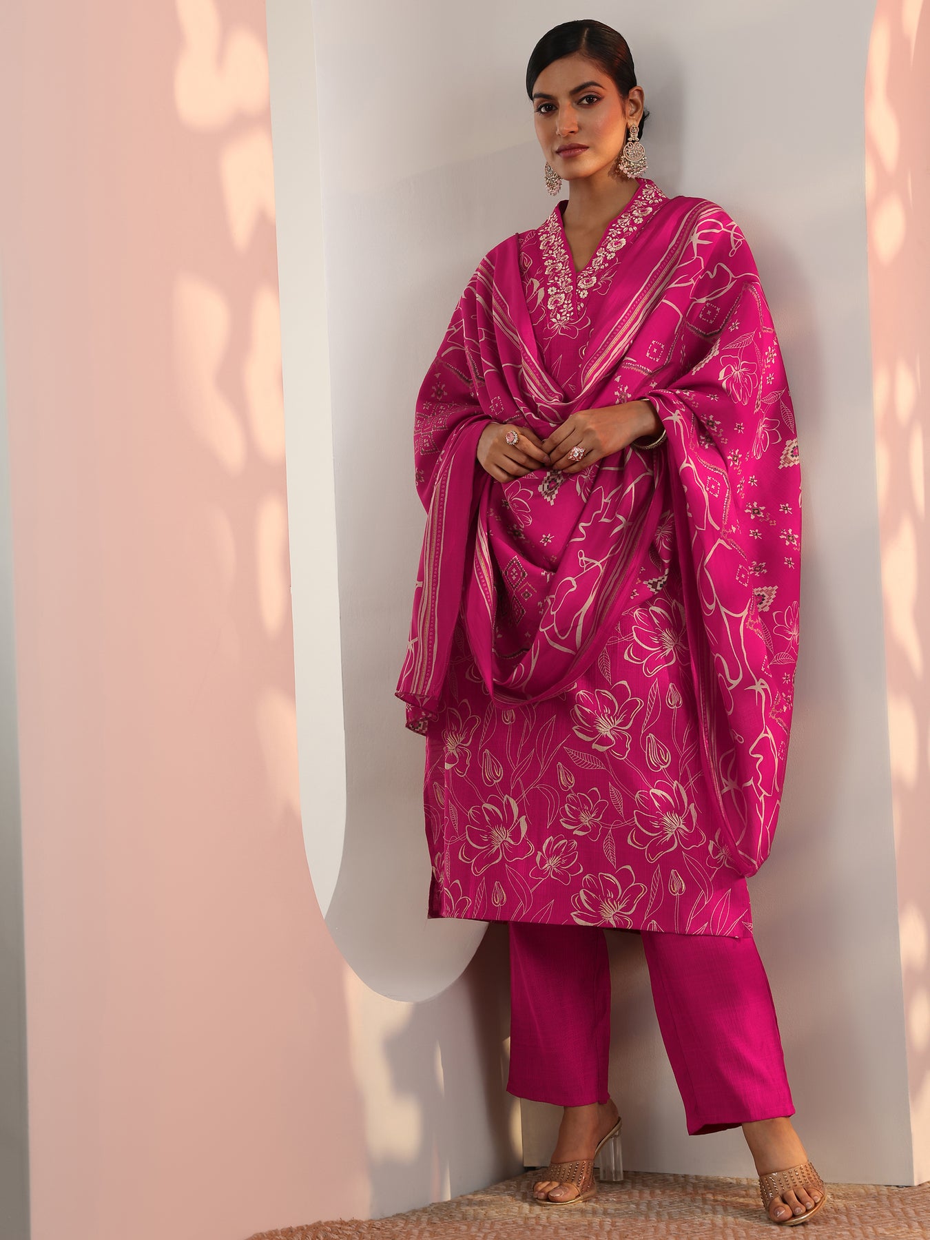 Pink Printed Silk Blend Straight Suit Set With Dupatta