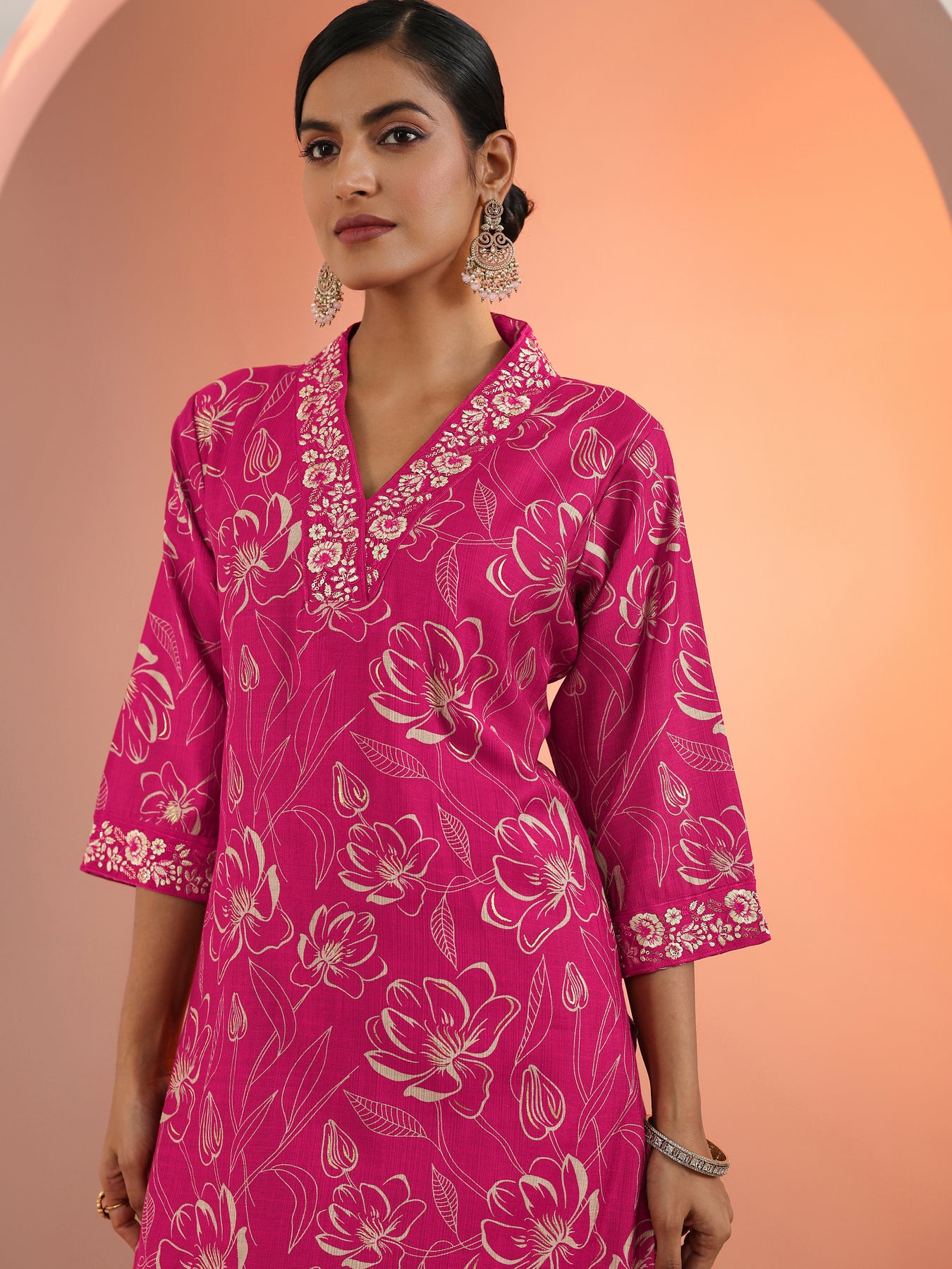 Our 3-piece pink silk blend kurta set features a straight-fit silhouette with a V-neckline, regular sleeves. Complemented with straight pants with a partially elasticated waistband and 2 pockets, and a printed dupatta. Adorned with floral printed accents, this style is perfect for festive wear.