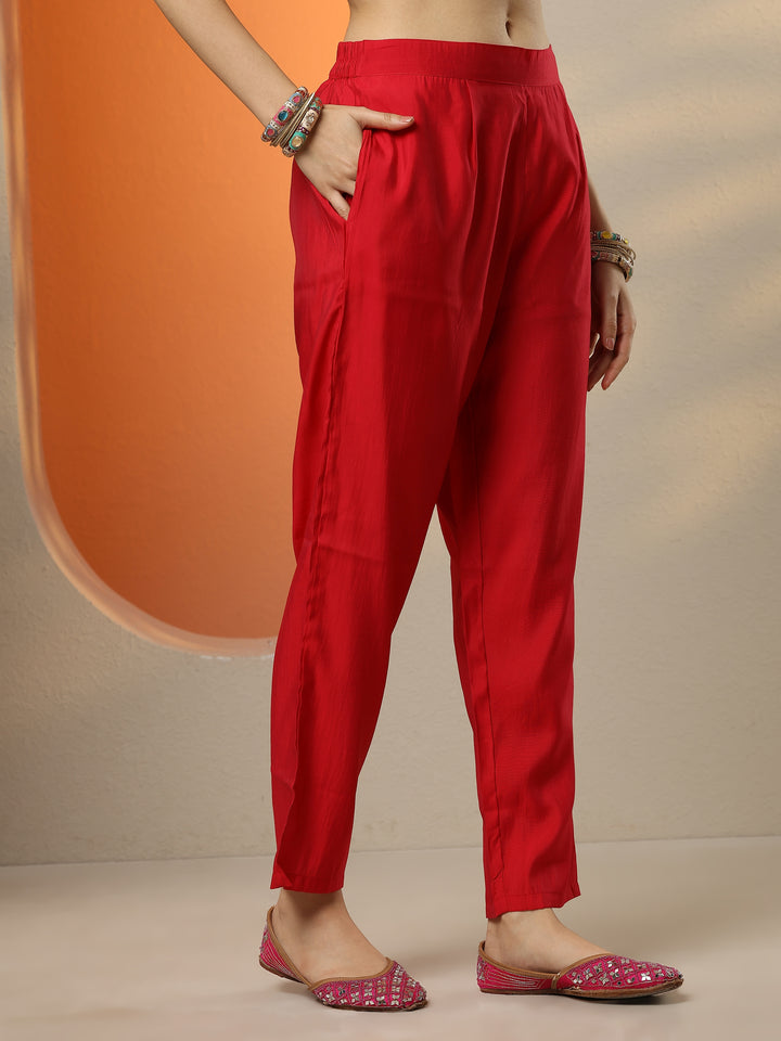 Our 3-piece Red Silk blend Straight-fit Kurta Set features a Mandarin Collar neckline, Regular Sleeves, and statement yoke. Complemented with Straight Pants with a Partially Elasticated waistband and 2 pockets, and an Embroidered dupatta. Adorned with Leheriya Printed, this style is perfect for Dark Festive.