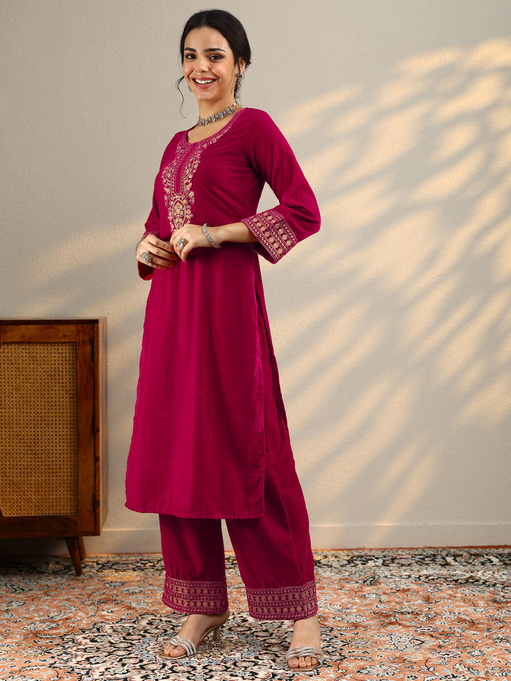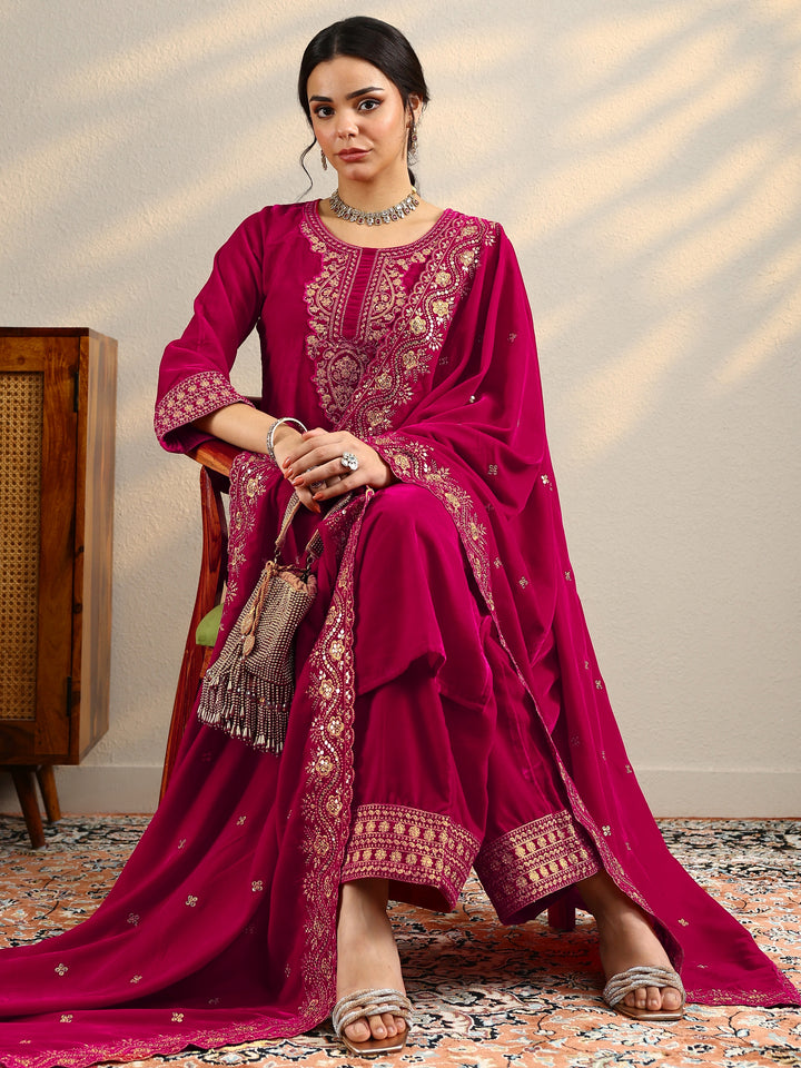 Pink Yoke Design Velvet Straight Suit Set With Dupatta
