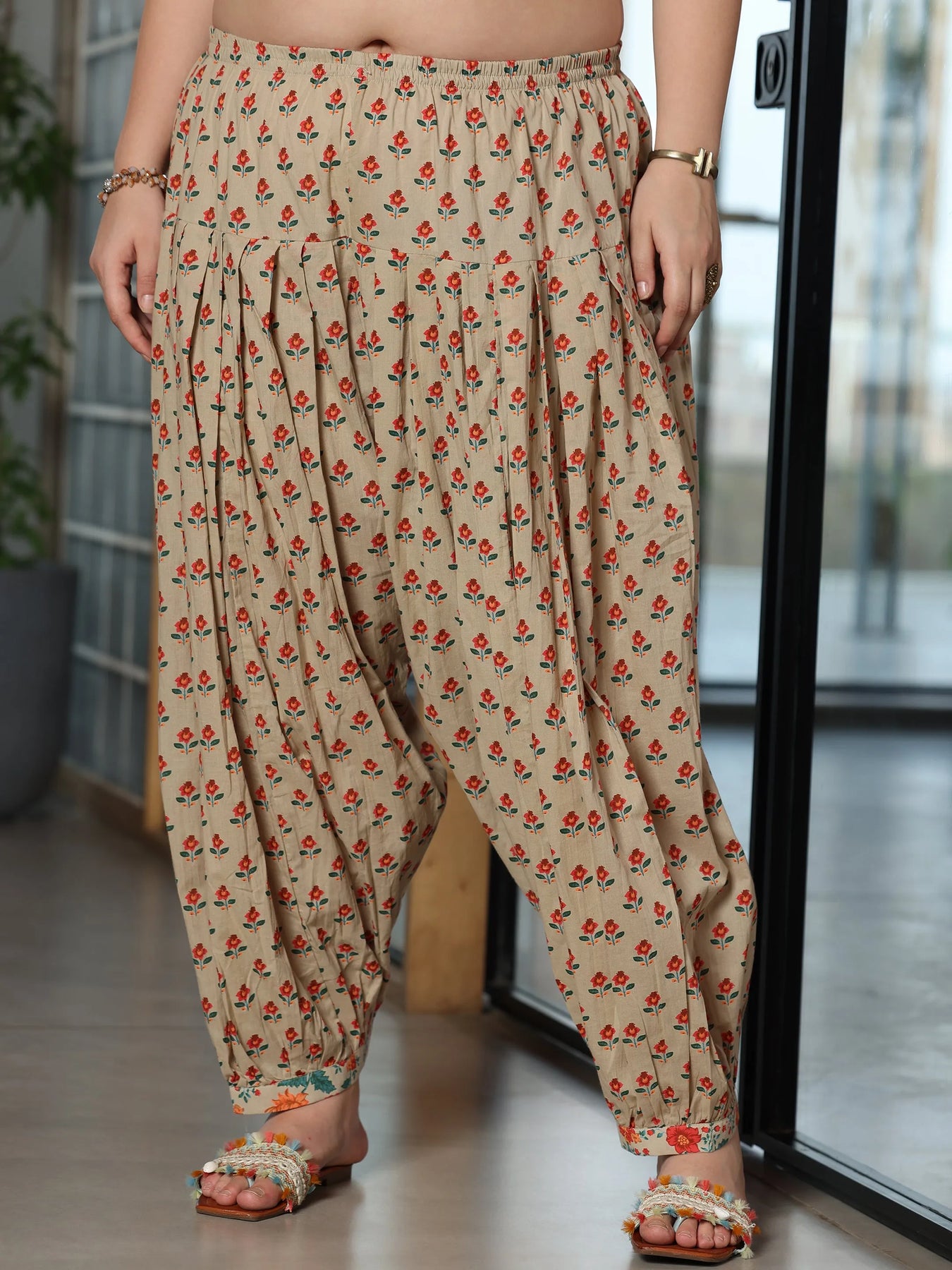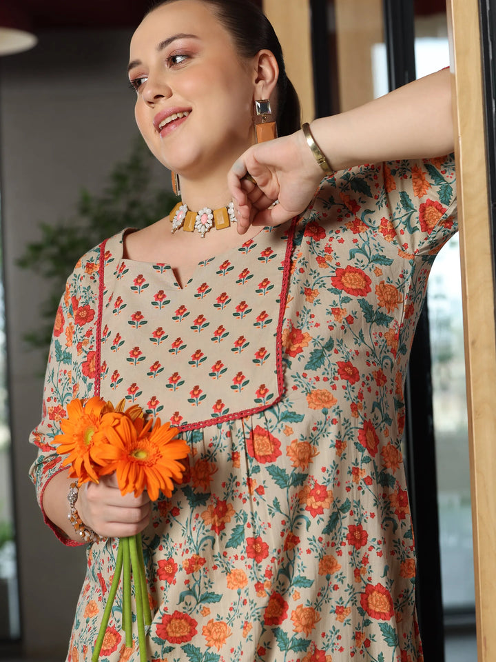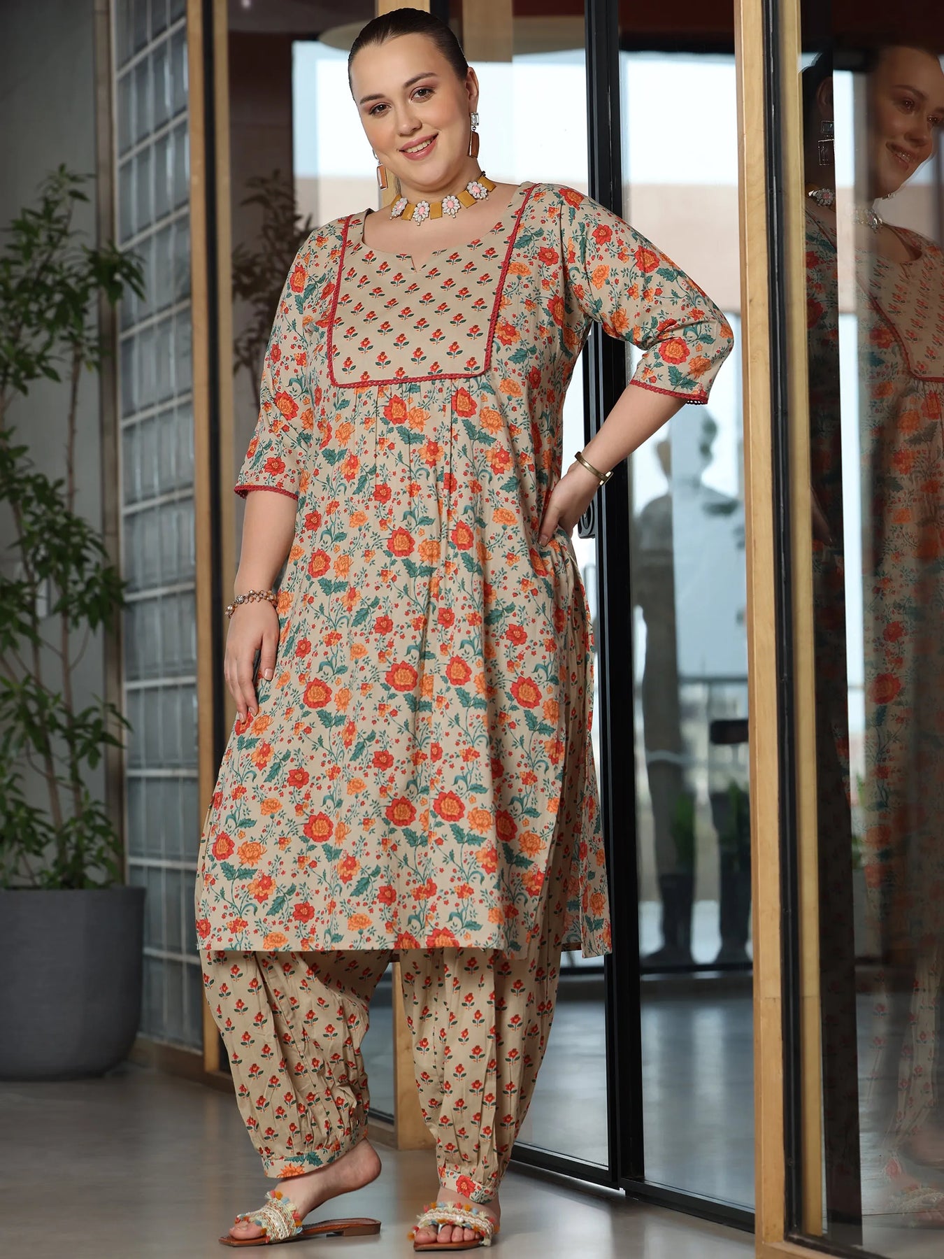 Libas Extra Love collection features our signature designs in comfortable plus sizes. Our 3-piece beige pure cotton kurta set features an A-line kurta with a square neckline, regular sleeves, and a statement yoke. Complemented with dhoti pants with an elasticated waistband, and a dupatta. Adorned with floral prints, this style is perfect for casual occasions.