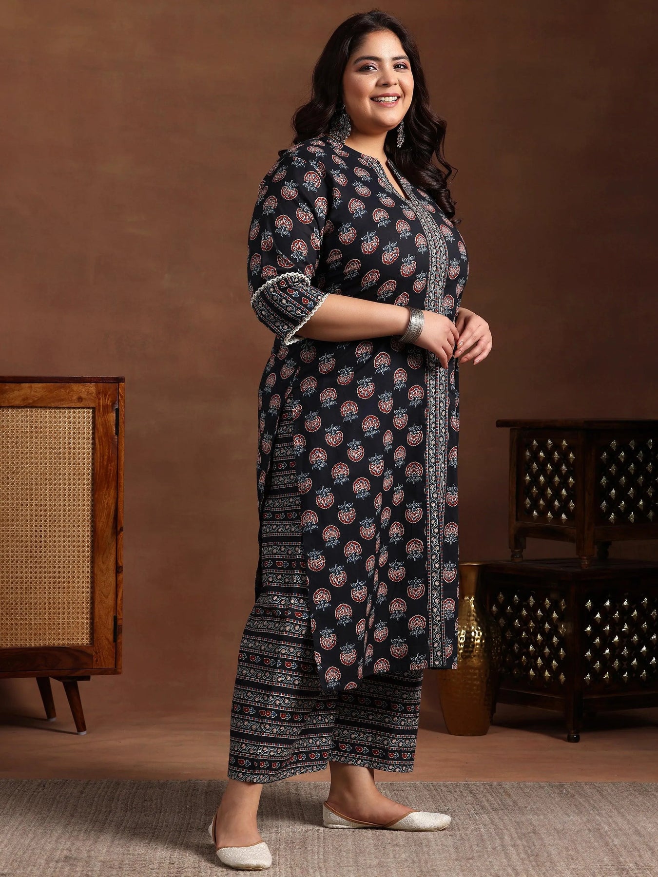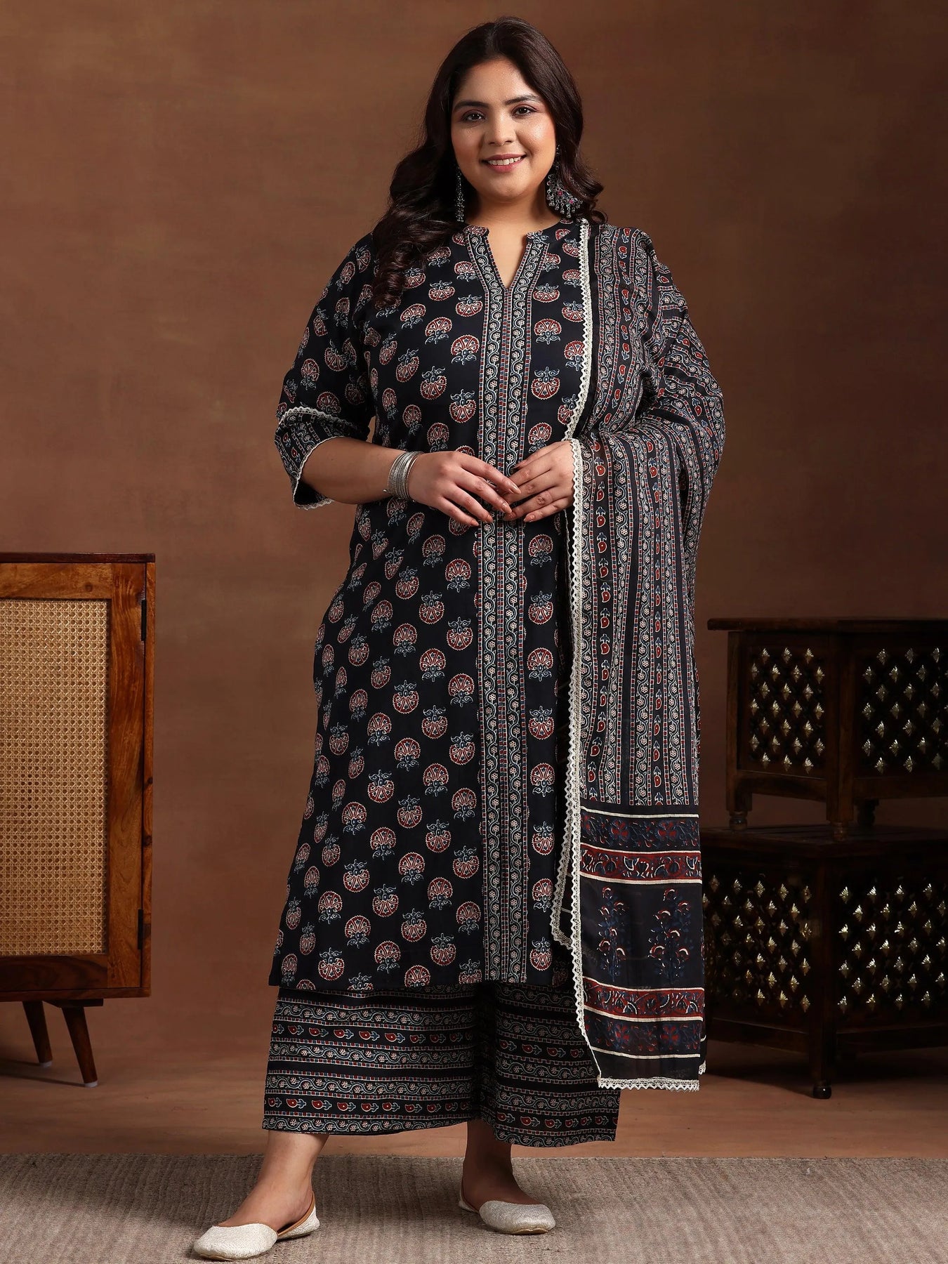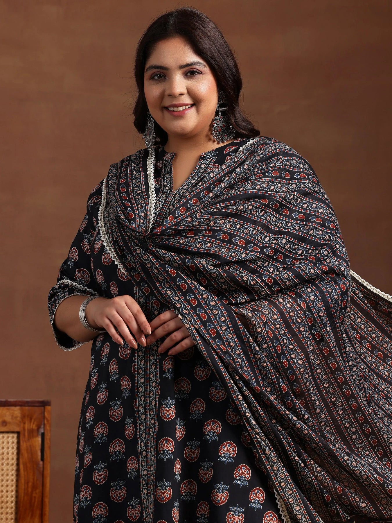 Plus Size Black Printed Cotton Straight Suit With Dupatta