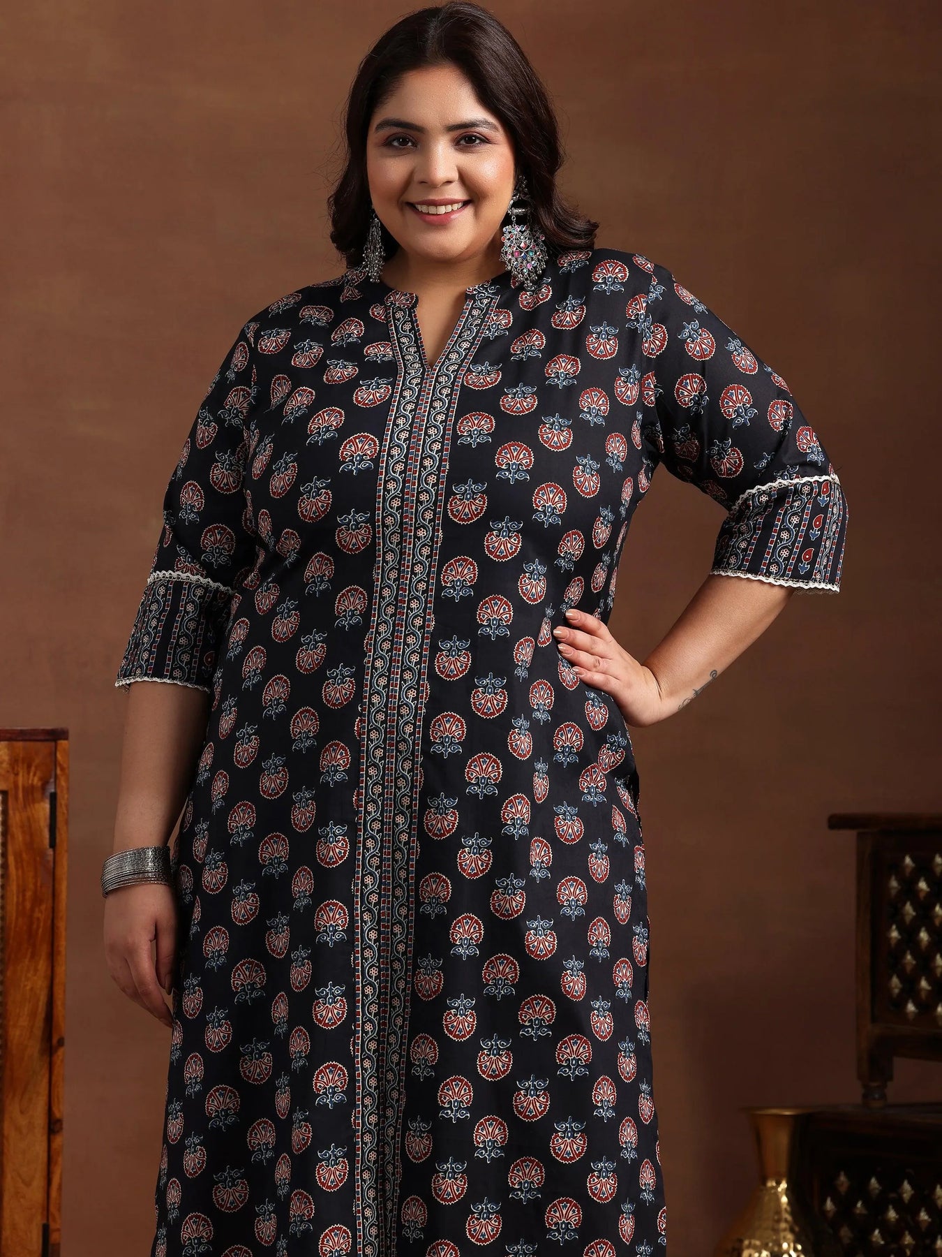 Libas Extra Love collection features our signature designs in comfortable plus sizes. Our 3-piece black printed cotton suit set features a straight-fit mandarin notched kurta with three-quarter sleeves. Complemented with palazzo pants with a partially elasticated waistband and roomy pockets, and a dupatta. Highlighted with Gota Patti and fabric-trim detailing, this style is perfect for casual outings.