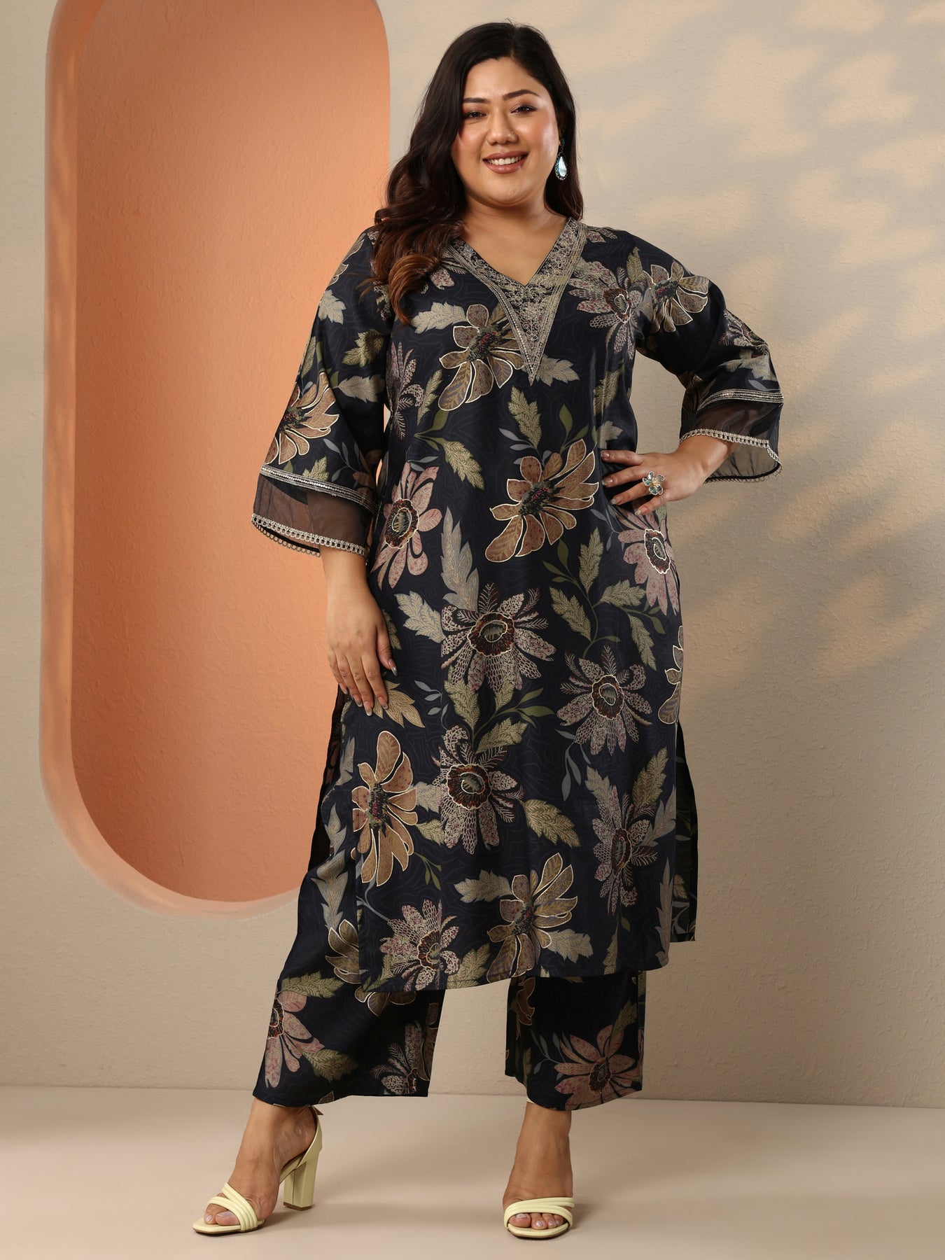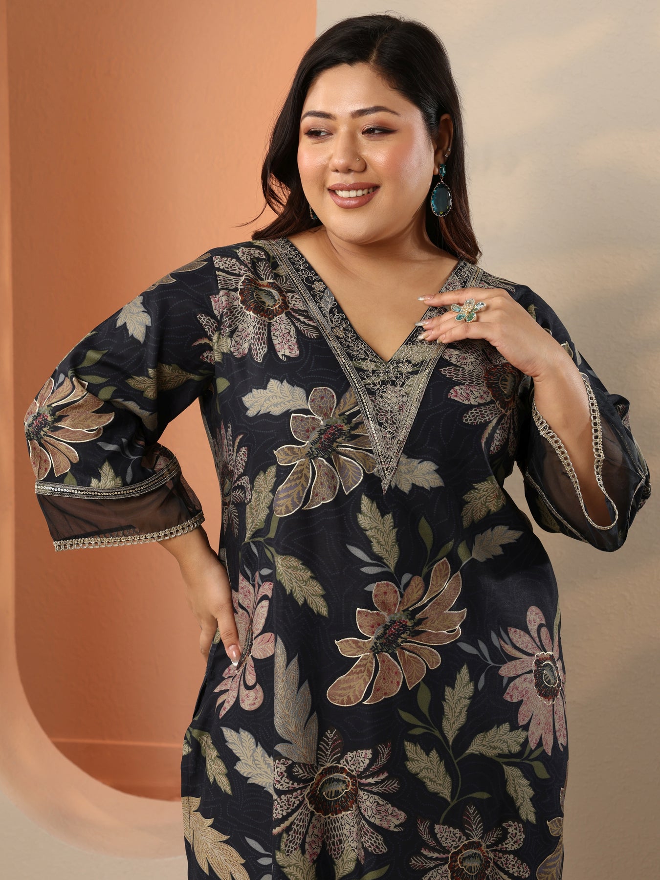 Plus Size Black Printed Silk Blend Straight Kurta Set