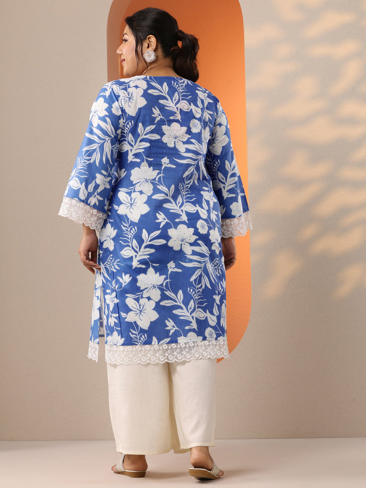 Plus Size Blue Embroidered Cotton Straight Kurta