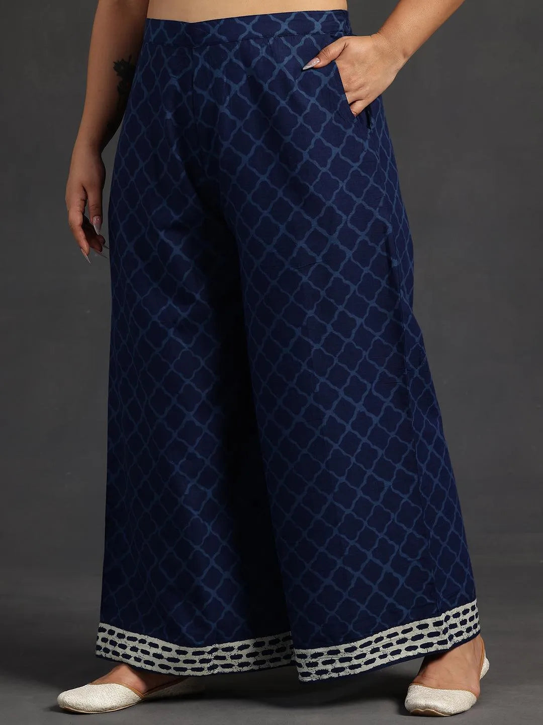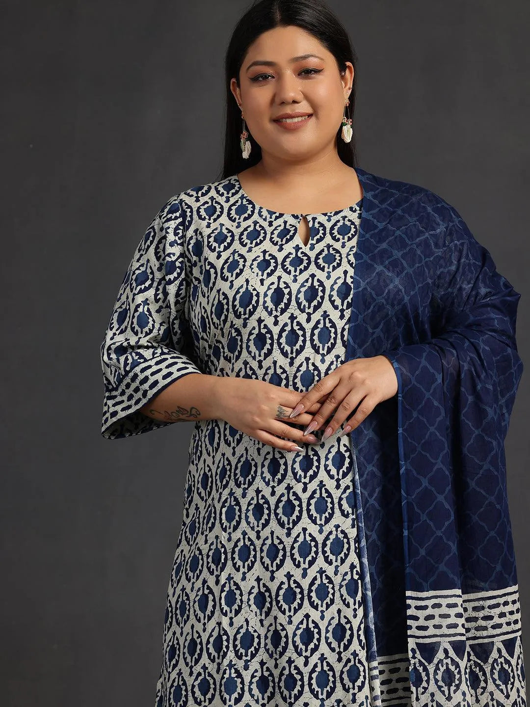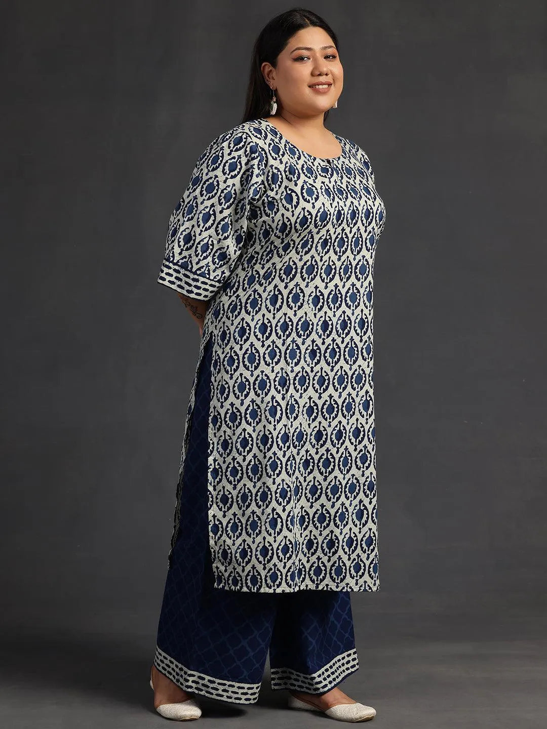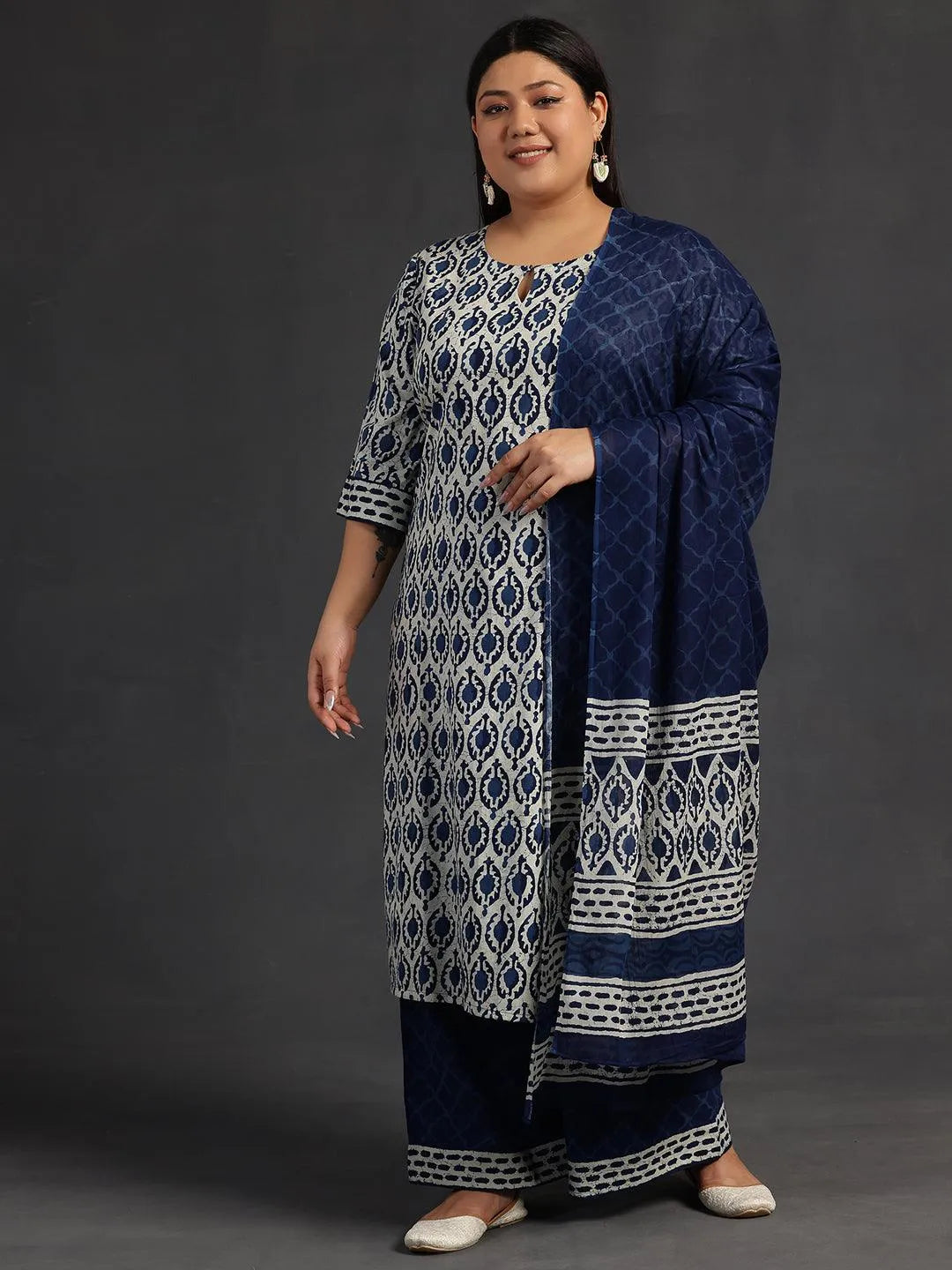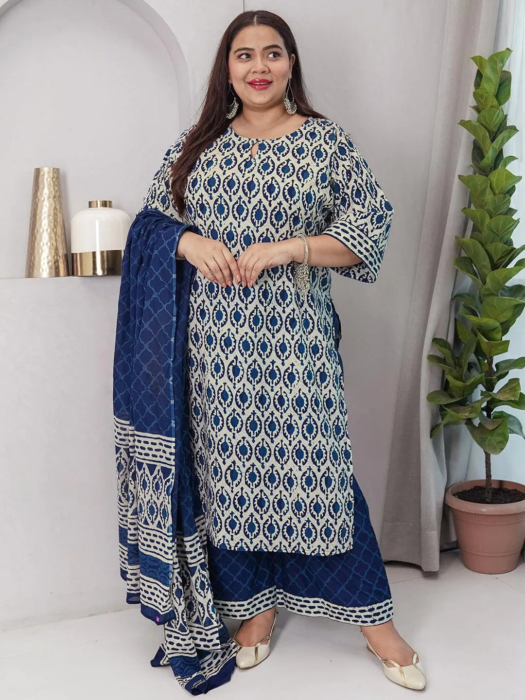 Libas Extra Love collection features our signature designs in comfortable plus sizes. Our 3-piece blue printed cotton suit set features a straight-fit kurta with a keyhole neckline and three-quarter flared sleeves. Complemented with palazzo pants with a partially elasticated waistband and roomy pockets, and a dupatta. Adorned with ethnic motifs prints, this style is perfect for elevated everyday wear.