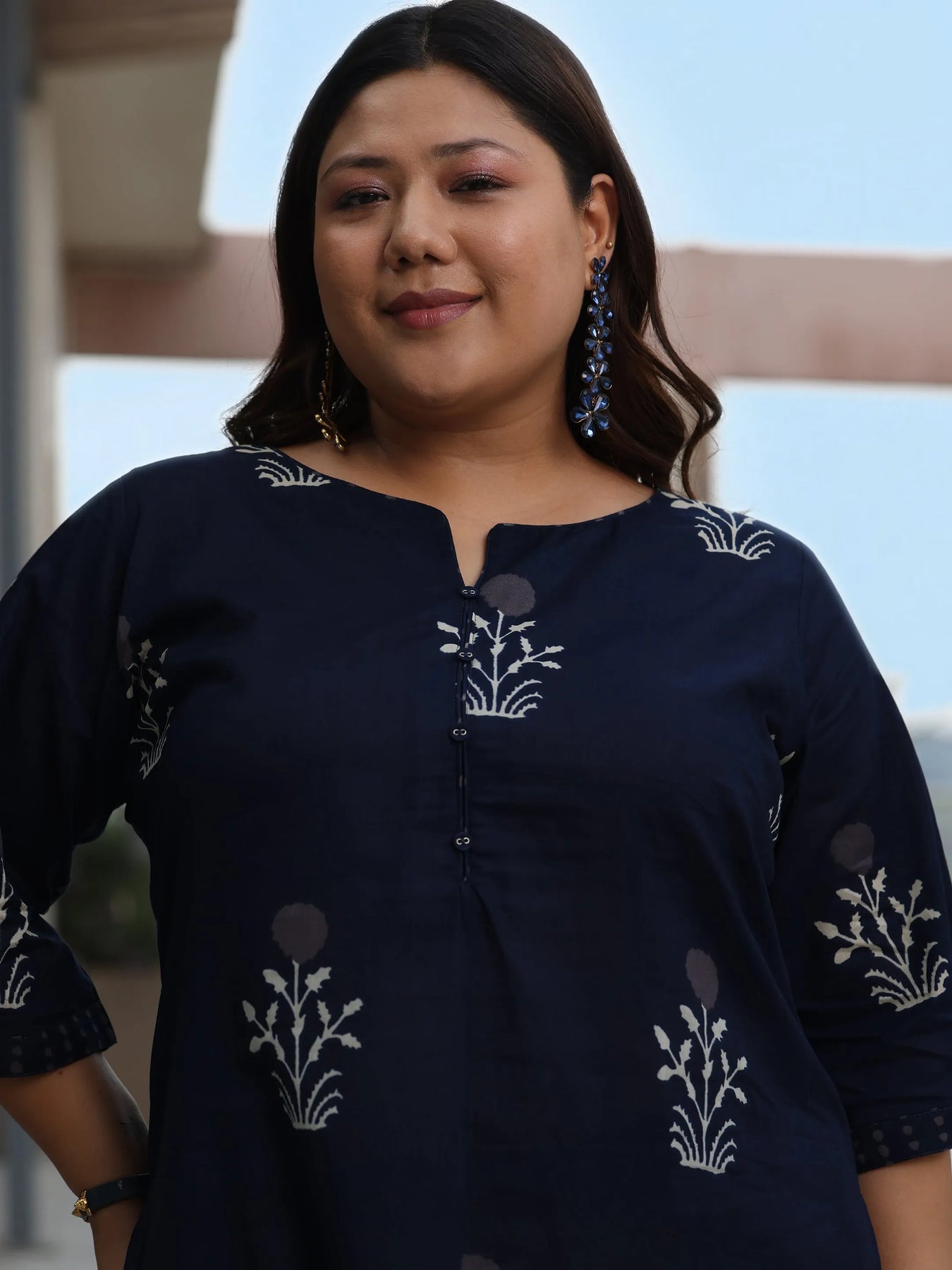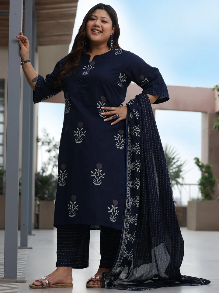 Plus Size Blue Printed Cotton Straight Suit With Dupatta