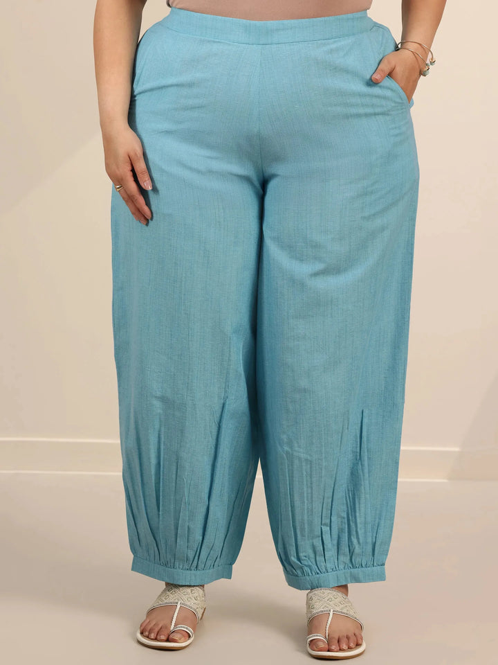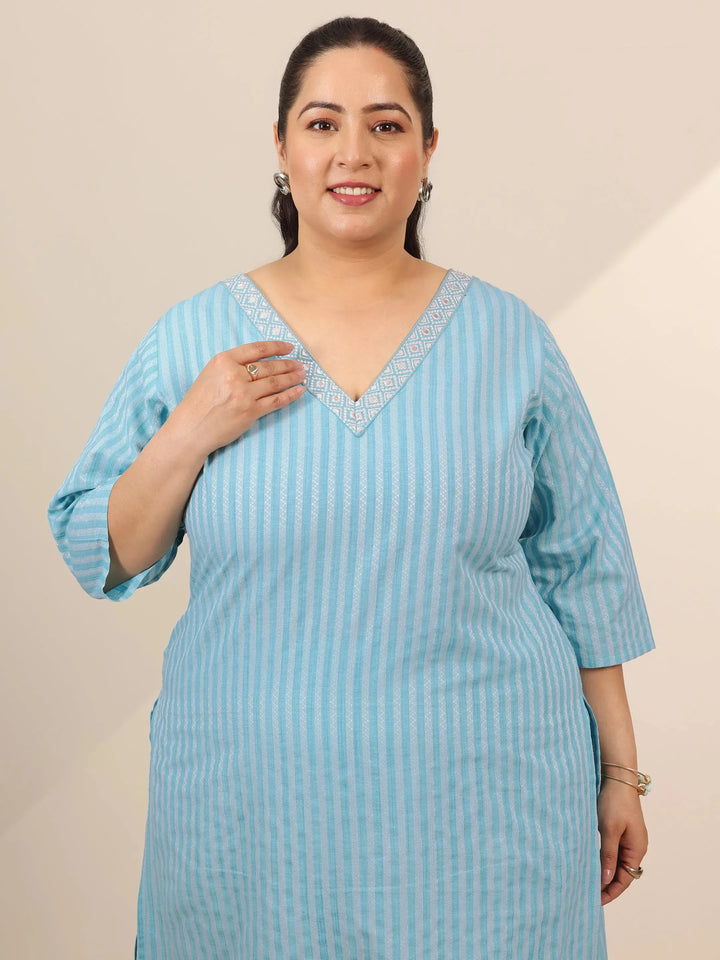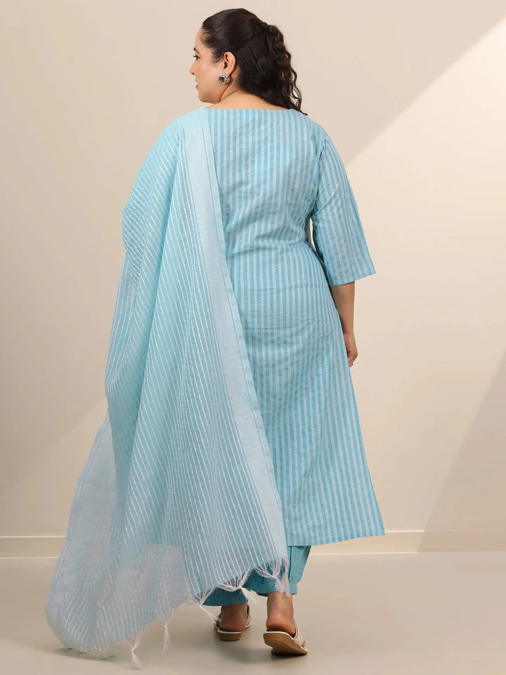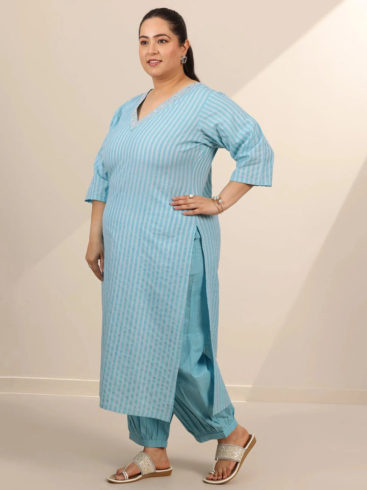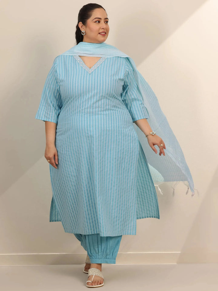 Libas Extra Love collection features our signature designs in comfortable plus sizes. Our 3-piece blue cotton blend straight-fit kurta set features a V-neckline, regular sleeves, and a statement yoke. Complemented with straight salwar pants with an elasticated waistband and 2 pockets, and a striped dupatta. Adorned with a woven design, this style is perfect for casual occasions.