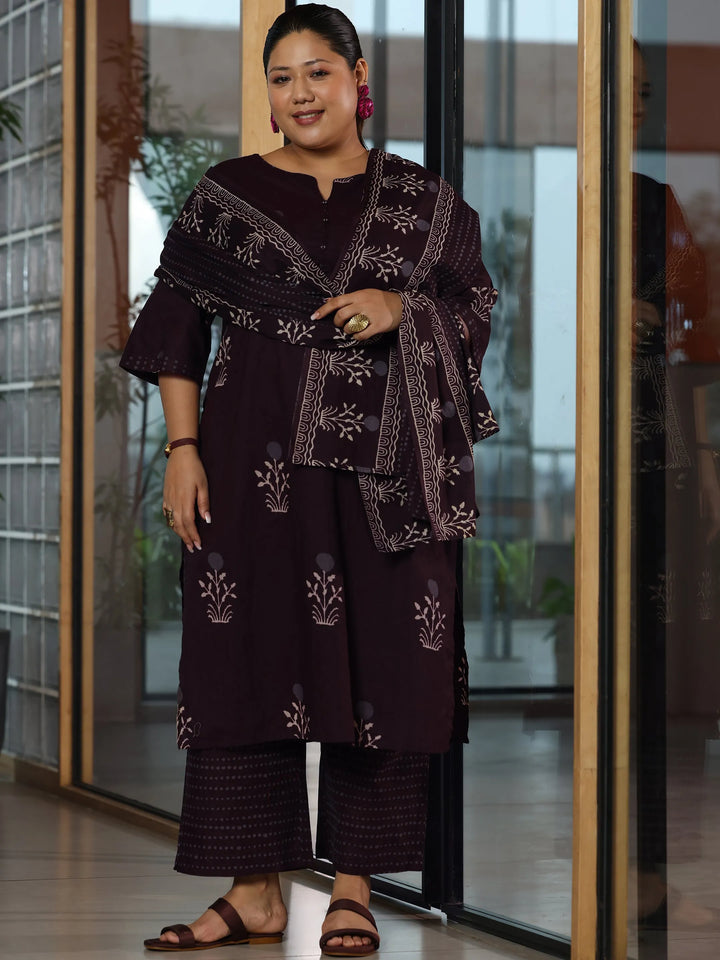 Plus Size Brown Printed Cotton Straight Suit With Dupatta